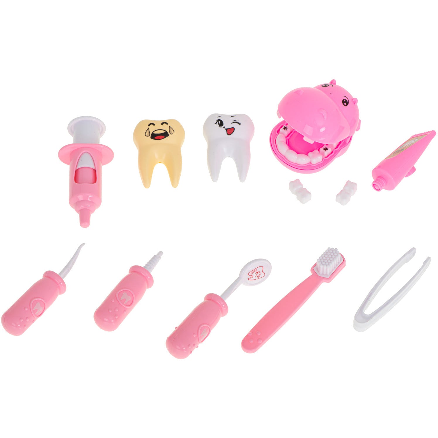 Maak een tandartsbezoek leuk én vertrouwd met deze 13-delige speelgoed tandarts set in roze nijlpaard uitvoering. Kinderen oefenen hun creativiteit, motoriek en sociale vaardigheden terwijl ze tandarts spelen met hun knuffels en poppen. Zo ontdekken ze het belang van mondhygiëne en wordt een echt tandartsbezoek ineens een stuk minder spannend.
