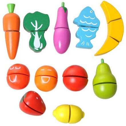 Realistische houten groenten en fruit: 14 verschillende stukken met kleurrijke details voor herkenning van vormen en kleuren.