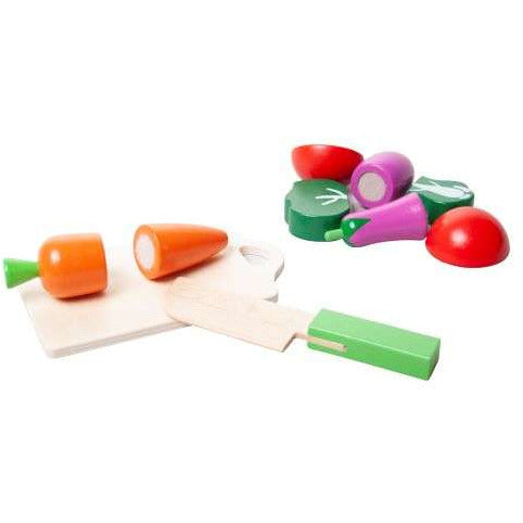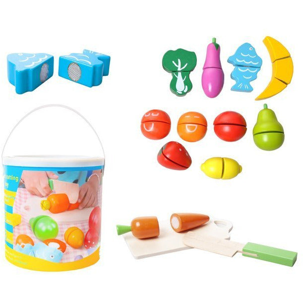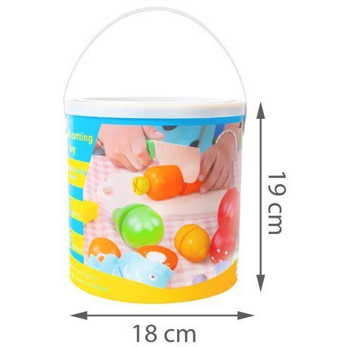 Inclusief: 1 kunststof mes, 14 houten groenten en fruitdelen, draagbare emmer