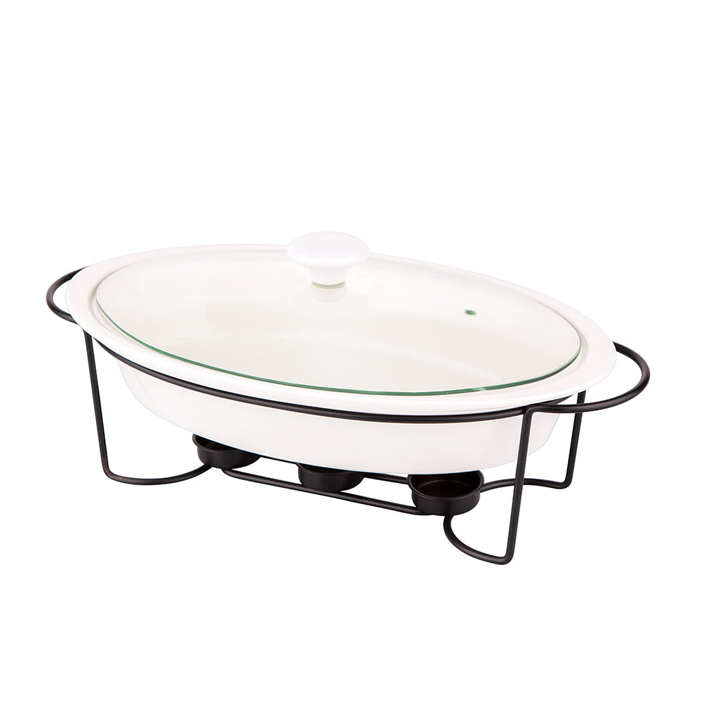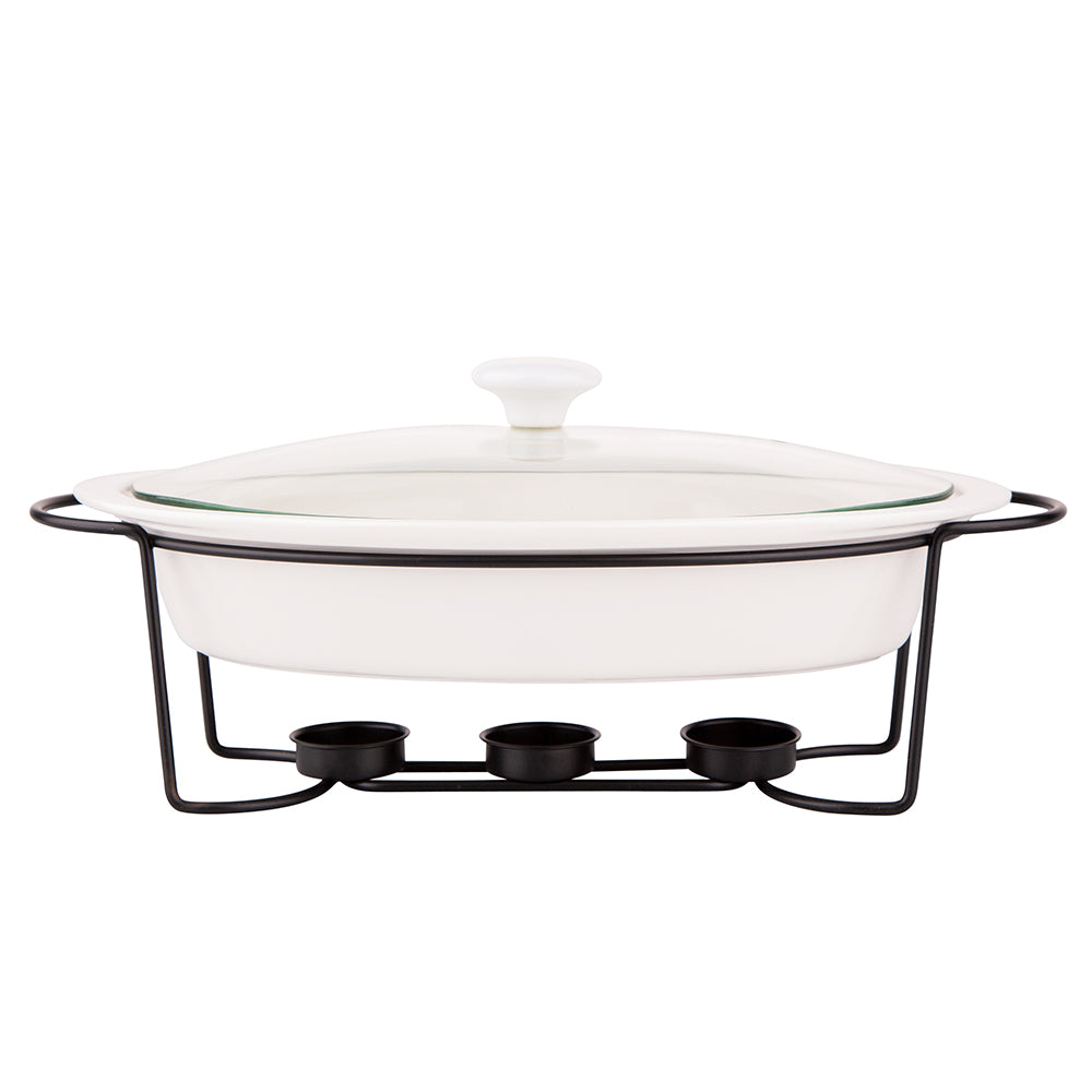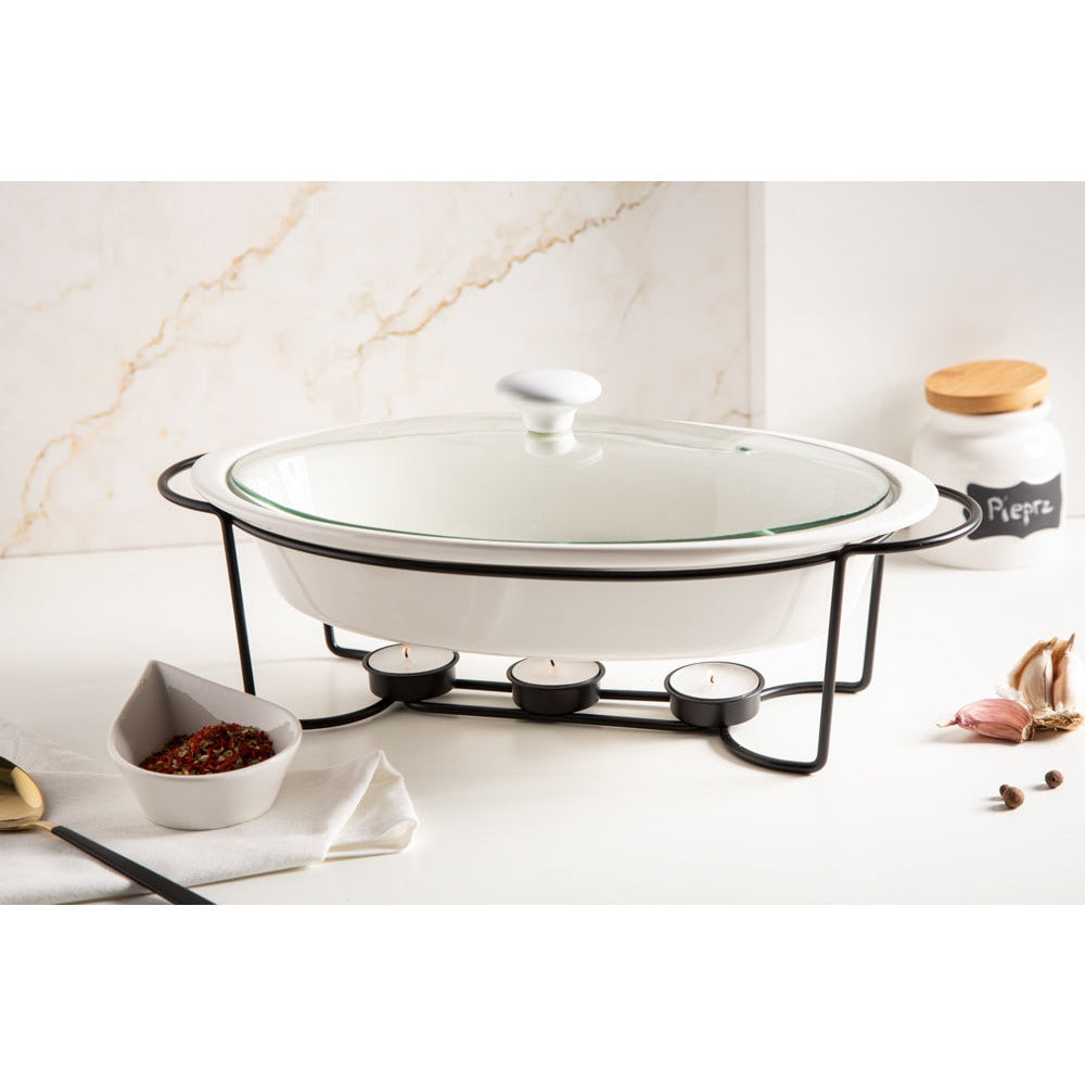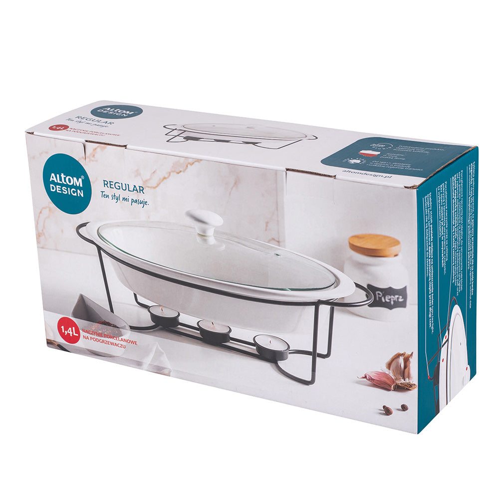 Altom Chafing dish - ideaal voor feestjes en grote groepen! Deze warmhoudbak van porselein heeft een inhoud van 1.4L en is vaatwasserbestendig. De deksel is gemaakt van gehard glas en de standaard van RVS voor een luxe uitstraling. Met plek voor 3 waxinelichtjes blijven je gerechten lang warm.
