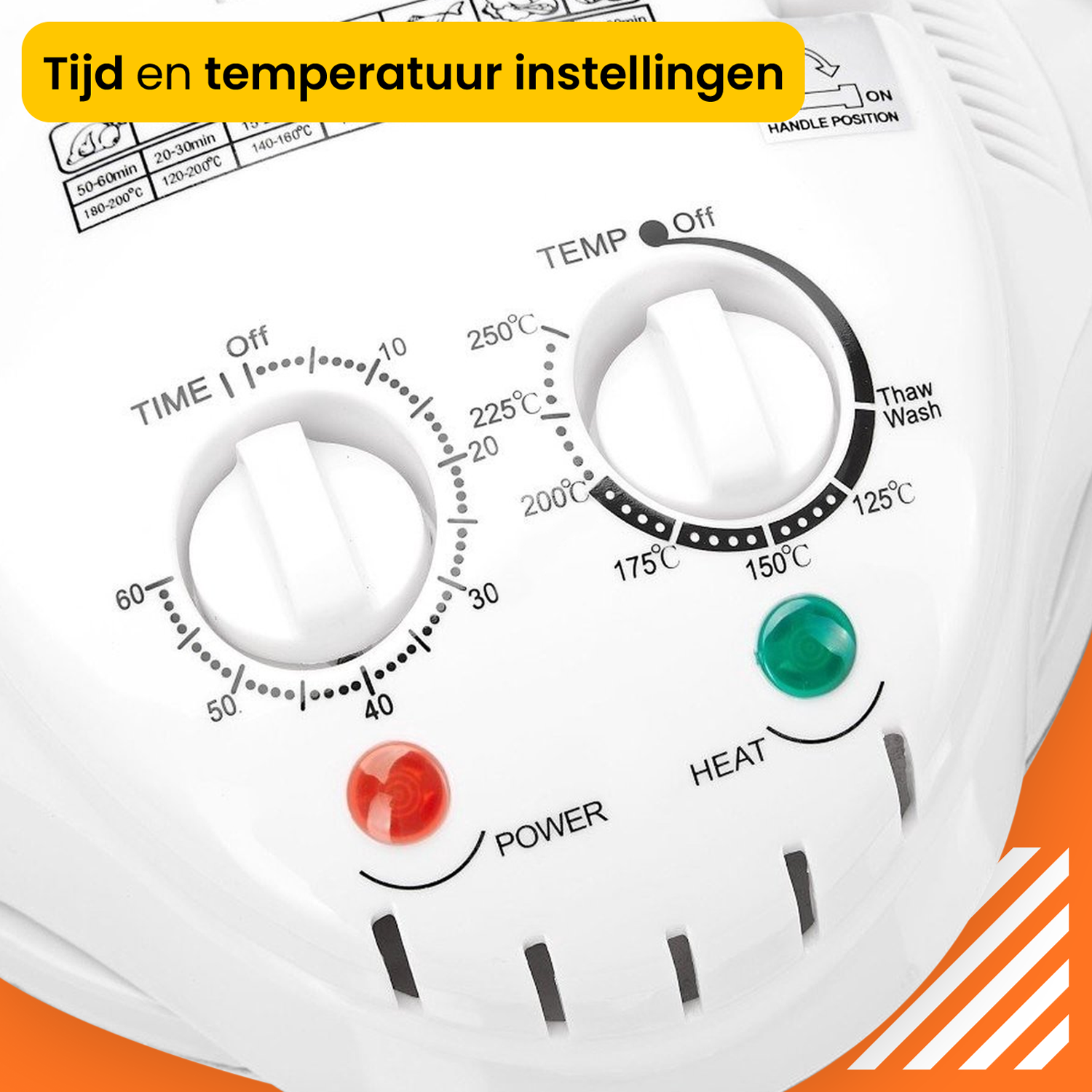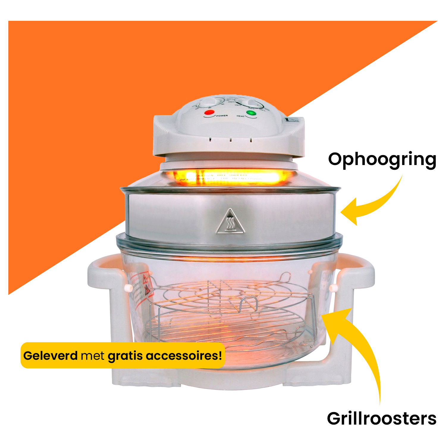 Met deze heteluchtoven van Botti is voedsel bereiden op een gezonde manier een simpel klusje. Door het gebruik van halogenen en circulerend lucht bakt de halogeenoven 3 tot 5 keer sneller dan een traditionele oven en biedt het een vetarme en gezonde voedselbereiding. De vitaminen en voedingsstoffen blijven behouden en worden gekookt zonder olie en vet. Door de meegeleverde ophoogring vergroot je de inhoudt met maar liefst 6 liter waarmee het totaal op 18 liter komt, dit is genoeg om eten te bereiden voor het hele gezin. Met de timer die je kunt instellen van 0 tot 60 minuten zal het ook makkelijk zijn om gerechten de juiste tijd te geven om te garen.