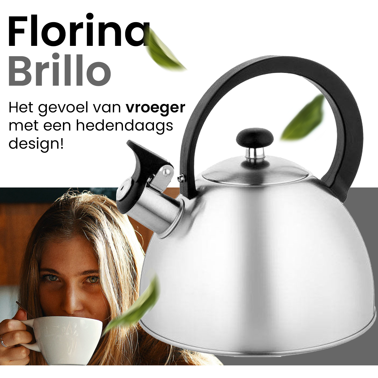 2de kansje Florina Brillo fluitketel geborsteld RVS zilver 2.5 Liter - ook geschikt voor inductie