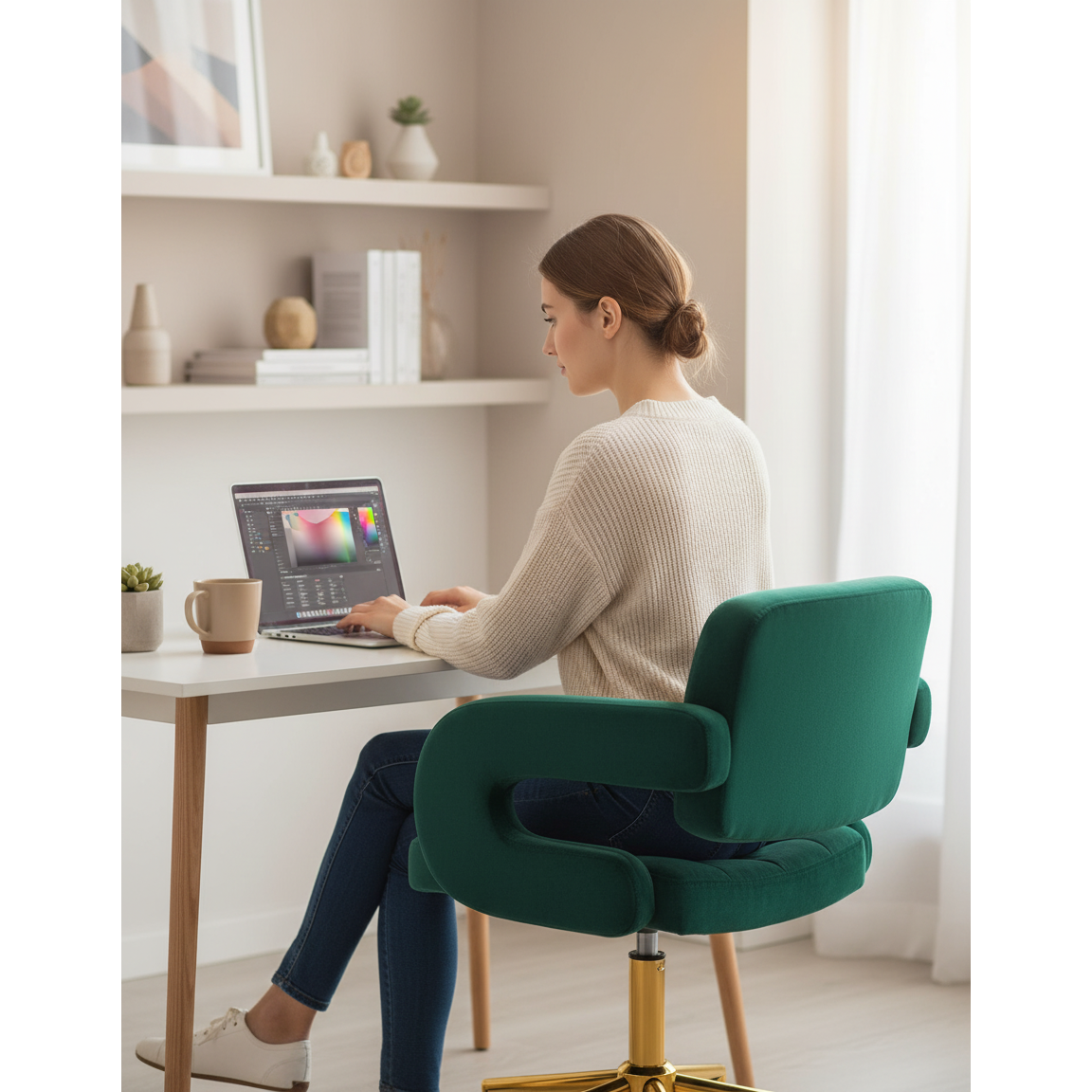 Zoek je een stijlvolle en comfortabele bureaustoel die zowel praktisch als elegant is? De 4Rico fluwelen bureaustoel in groen combineert een luxe fluwelen bekleding met een gouden metalen frame voor een chique uitstraling. Dankzij de verstelbare zithoogte (43–58 cm), de ergonomische vormgeving en de zachte fluwelen zitting is deze stoel ideaal voor gebruik in een salon, kantoor, receptie of thuiswerkplek.