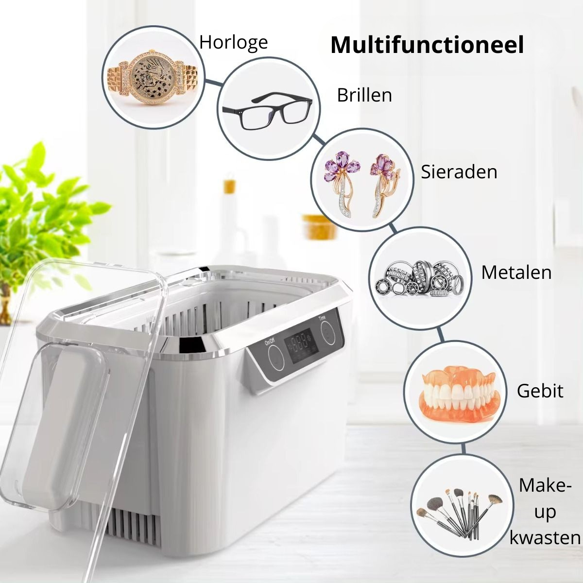 - Reinigt en desinfecteert jouw sieraden, brillen en make-up kwasten met gemak.