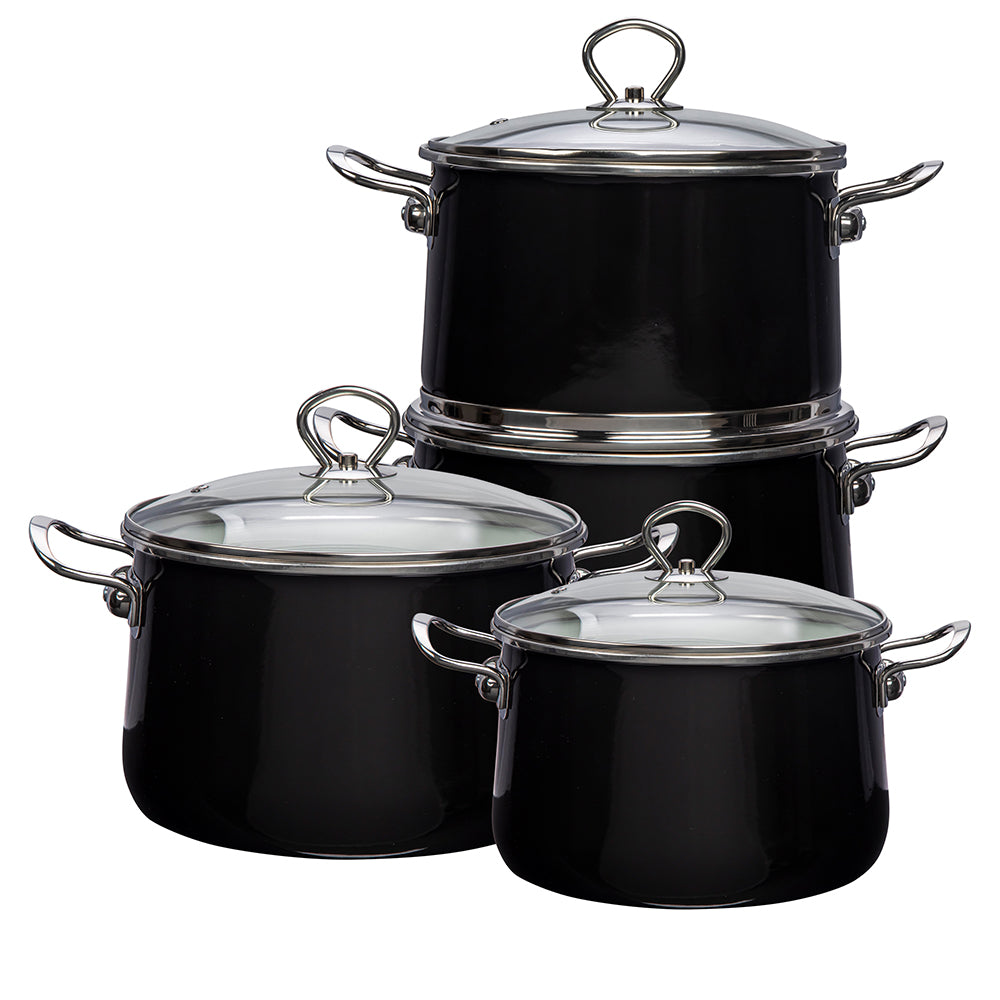 Toe aan nieuwe pannen? Zijn je oude pannen helemaal af? Met de exclusieve retro zwarte pannenset Izydor heb je eindelijk een limited edition emaille kookpannenset in huis! Gemaakt van hoogwaardig materiaal en geschikt voor alle warmtebronnen. Met vier formaten pannen en gehard glazen deksels, ben je altijd voorbereid op elk gerecht. Kook in stijl met deze prachtige exclusief design pannenset van Altom design!