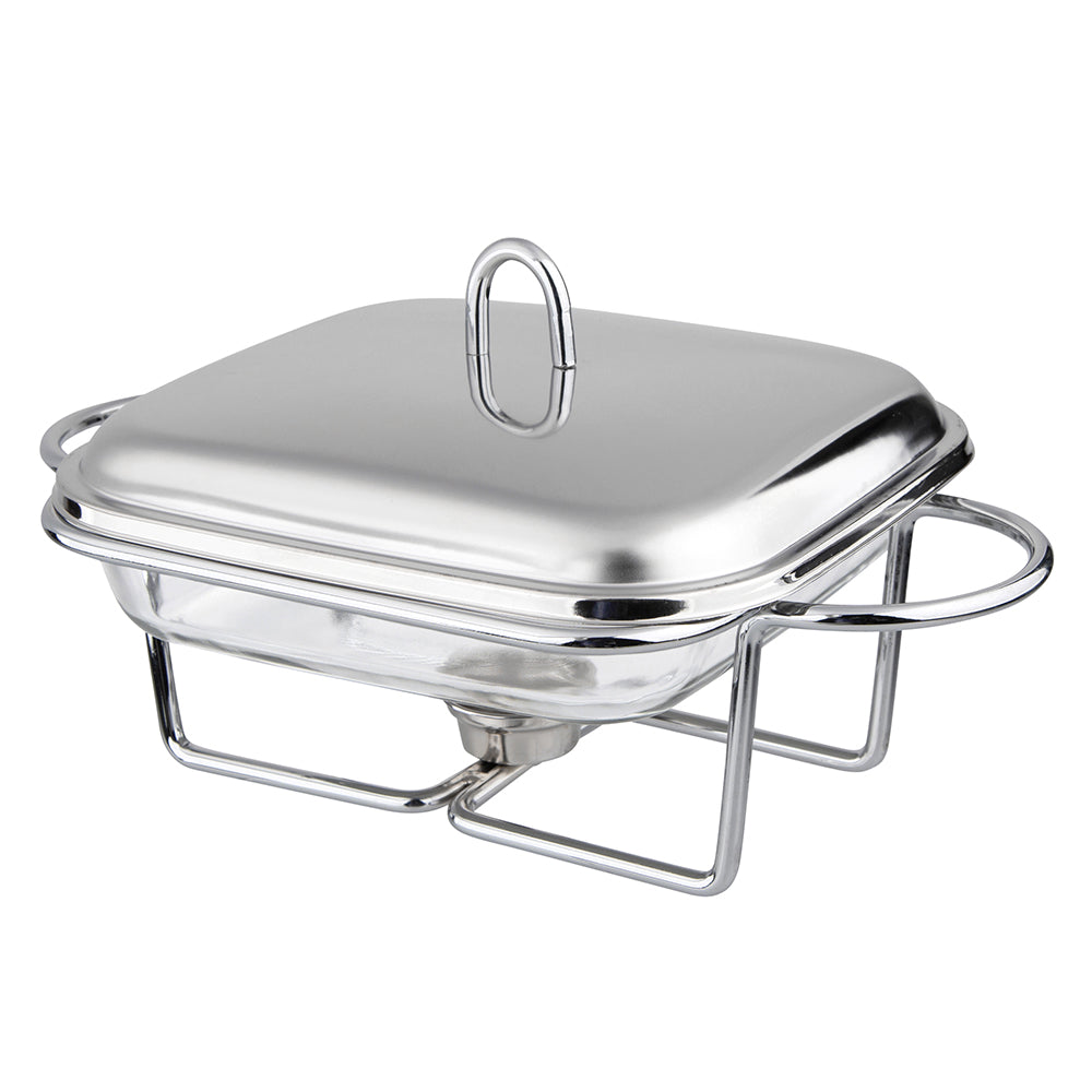 De chafing dish heeft een heater voor warme gerechten en beschermt de inhoud met een roestvrijstalen deksel.