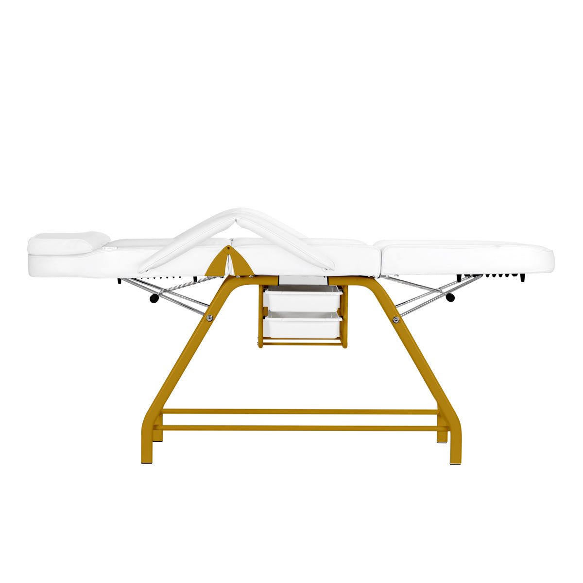 De Behandelstoel 557G met Trays Goud–Wit combineert een opvallend luxe design met de functionaliteit die professionals nodig hebben. Dankzij de halfmat goudkleurige metalen basis, de witte eco-lederen bekleding, de handmatig verstelbare rug- en beensteunen en de ingebouwde trays, is deze behandelstoel ideaal voor schoonheidssalons, massagesalons, skin therapists, PMU-specialisten en tattoostudio’s.