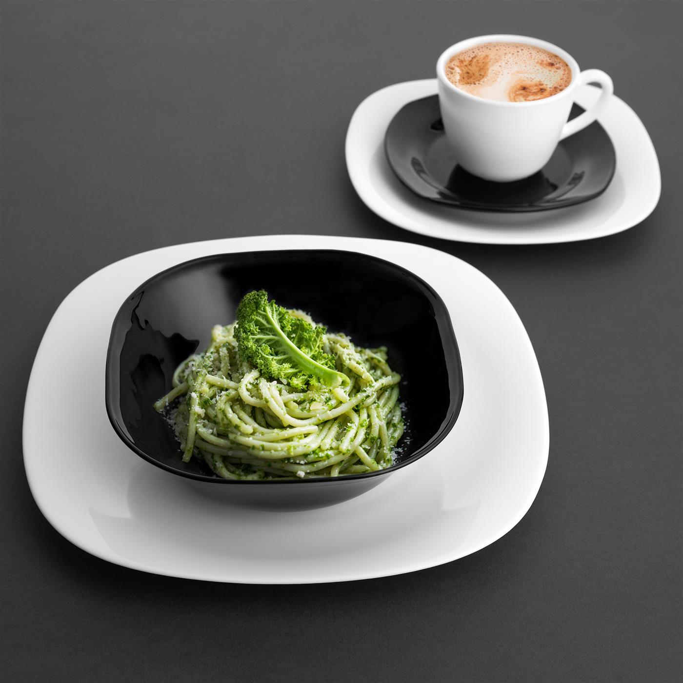 6 dinerborden 27×27 cm (wit), 6 soepborden 19×19 cm (zwart), 6 dessertborden 20×20 cm (wit), 6 schotels (zwart), 6 kopjes (wit).