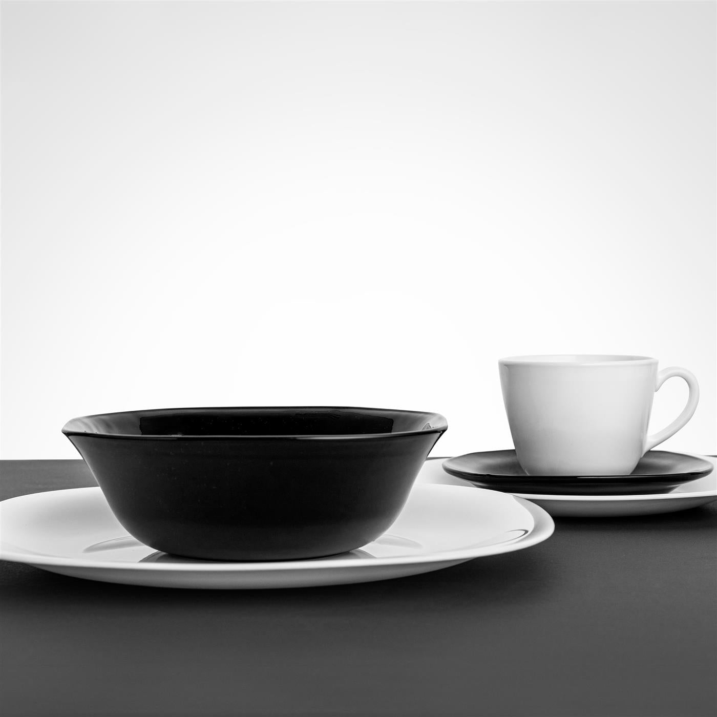 Complete set voor 6 personen – 6 dinerborden (wit), 6 soepborden (zwart), 6 dessertborden (wit), 6 schotels (zwart), 6 kopjes (wit).