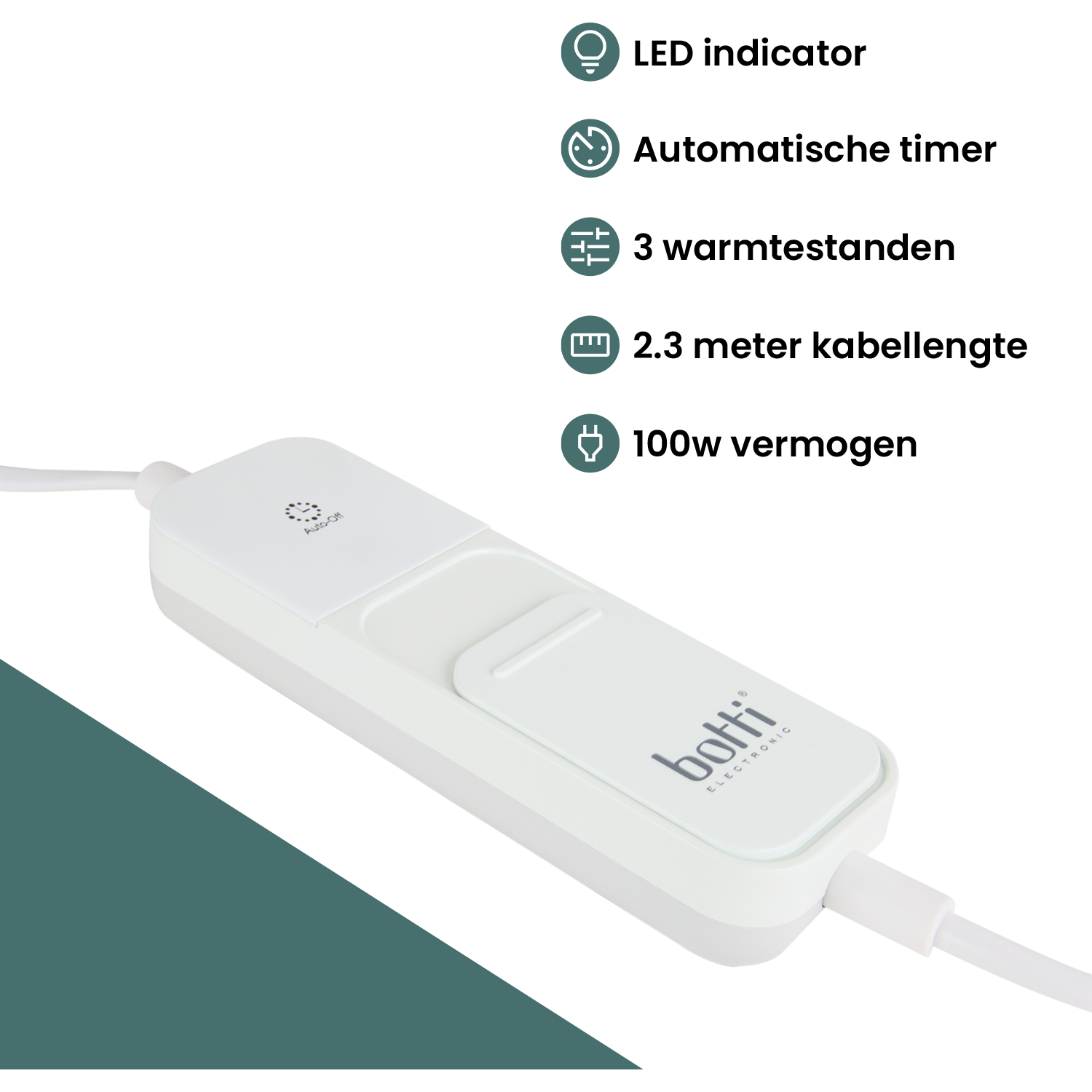 Heb je vaak last van koude avonden of stijve spieren? Met de Botti Reni verwarmingskussen 100W geniet je in enkele minuten van comfortabele warmte en ontspanning. Het kussen heeft 3 instelbare warmtestanden, een zachte fleece hoes en een handige afstandsbediening. Dankzij de oververhittingsbeveiliging en automatische uitschakeling na 90 minuten gebruik je dit warmtekussen altijd veilig en zorgeloos. Perfect voor op de bank of in bed, tijdens lezen, tv-kijken of relaxen.
