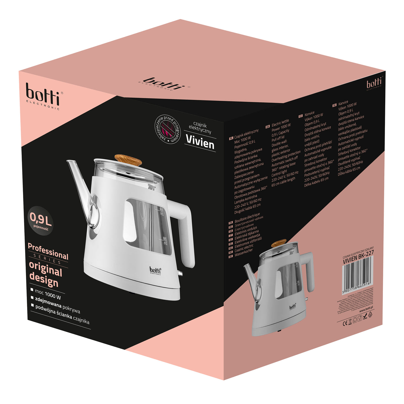 Zoek je een glazen waterkoker die niet alleen praktisch maar ook een echte blikvanger in je keuken is? De Botti Vivien Professional series waterkoker 0,9 L combineert een klassiek waterketel-design met moderne technologie. Dankzij het verborgen verwarmingselement en het hittebestendig glas is de waterkoker duurzaam, veilig en eenvoudig schoon te houden. Met 1000 W vermogen kook je snel water, ideaal voor kleine huishoudens, studenten of als tweede waterkoker voor thee en koffie.
