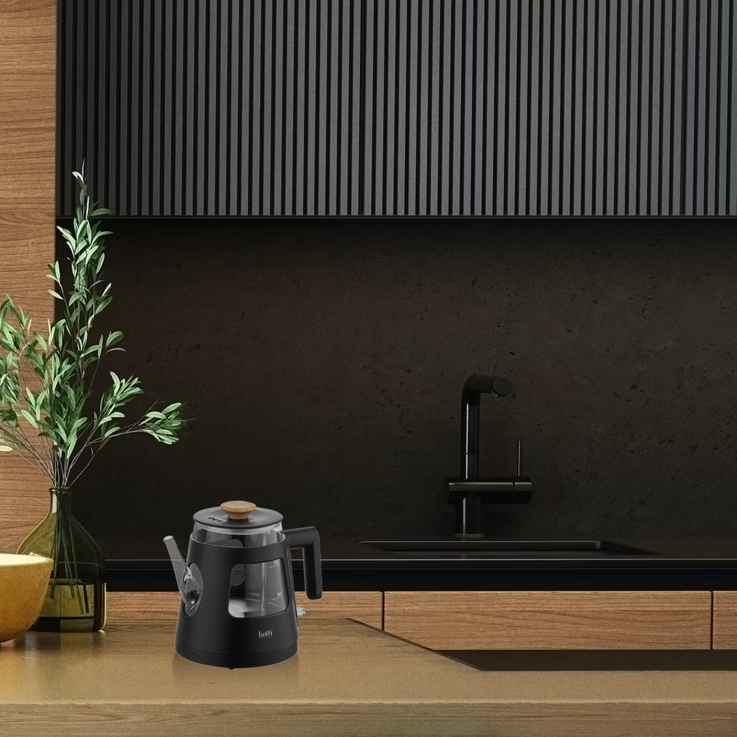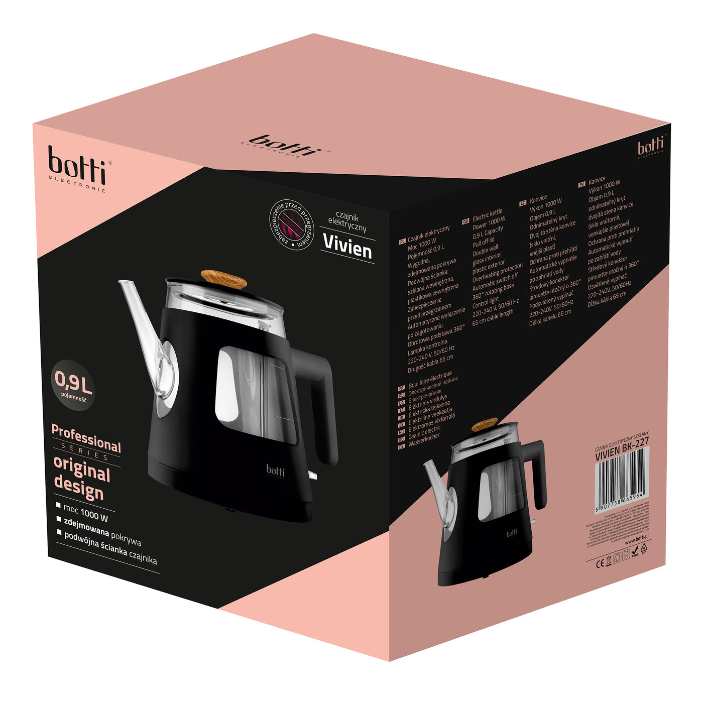 Met de Botti Vivien glazen waterkoker zwart 0,9 L haal je een moderne, compacte en veilige blikvanger in huis. Voeg stijl en gemak toe aan je keuken met een krachtige waterkoker die perfect bij jouw interieur past!