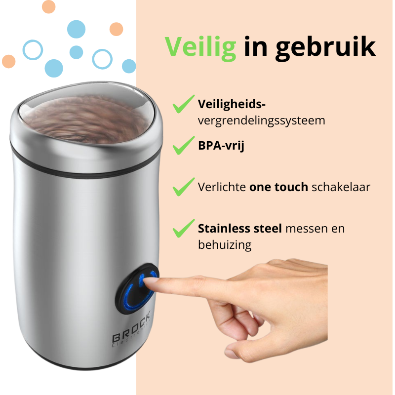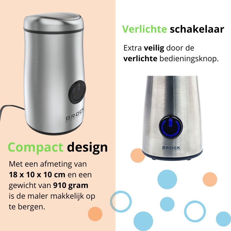 Begin elke dag met de geur van versgemalen koffie dankzij de Brock Elektrische Koffiemolen. Deze stijlvolle koffiemolen met 150W vermogen en duurzaam RVS mes maalt jouw koffiebonen razendsnel en vrijwel geluidloos. Niet alleen perfect voor koffie, maar ook ideaal als specerijenmolen, kruidenmolen of notenmolen – allemaal in één compact, BPA-vrij apparaat.