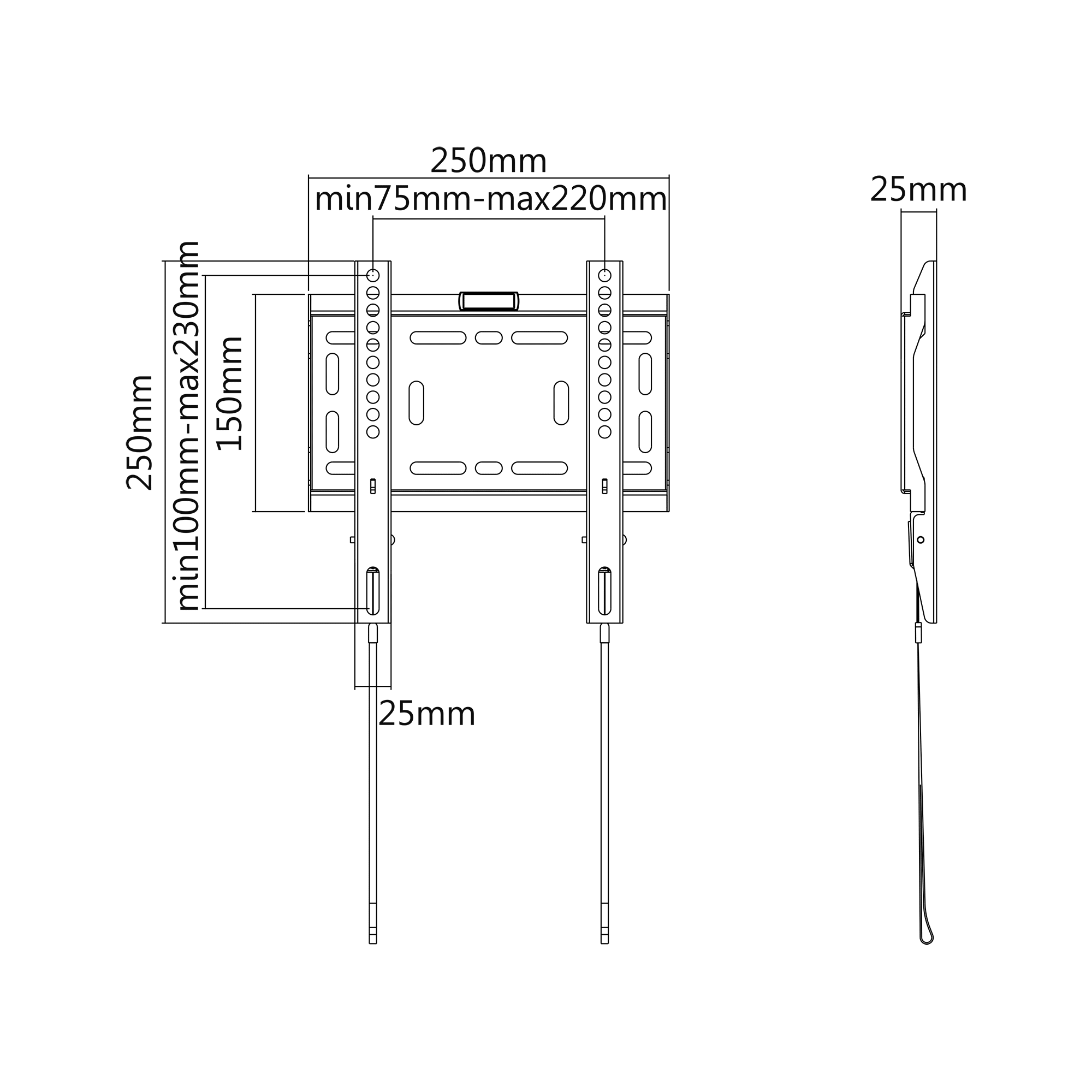 Deze muurbeugel zorgt voor een minimale afstand tot de muur van slechts 25 mm, waardoor je tv een moderne en minimalistische uitstraling krijgt. De afstand tot de muur van de tv is vast en kan niet versteld worden.