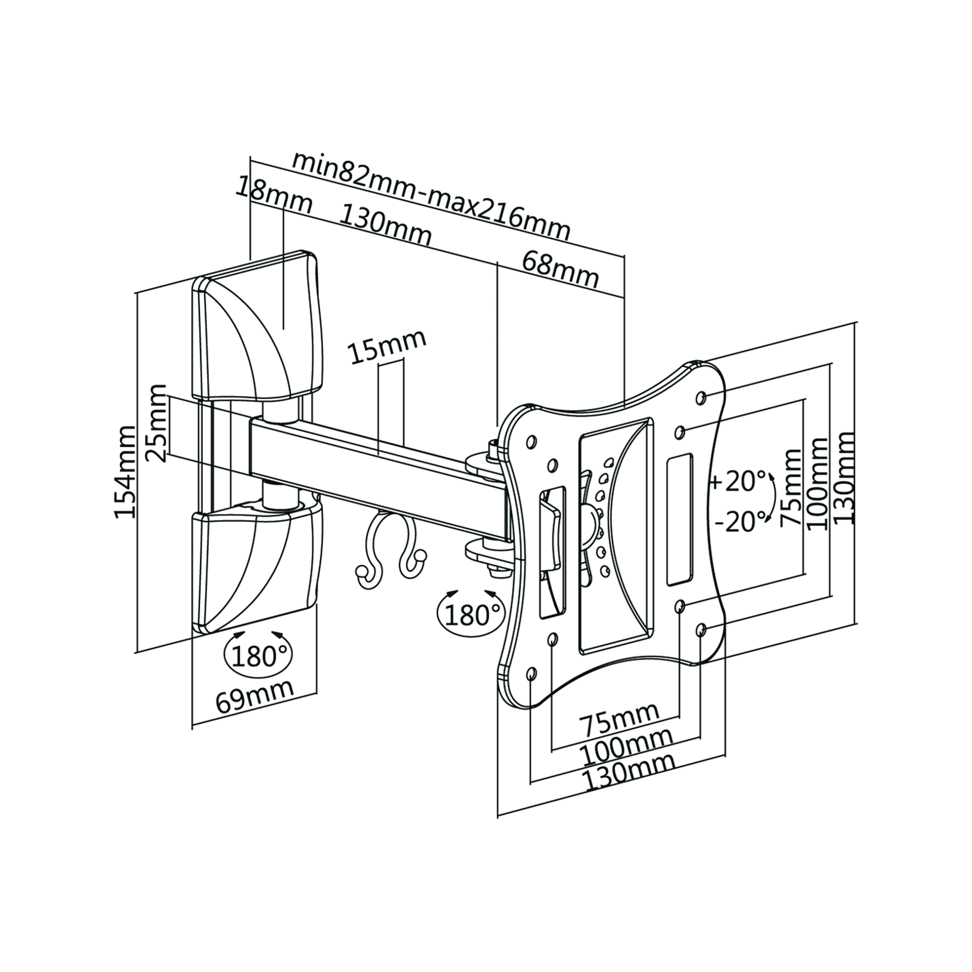 - Afstand tot de muur: 82 ~ 216 mm