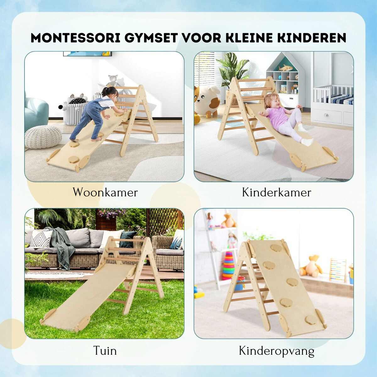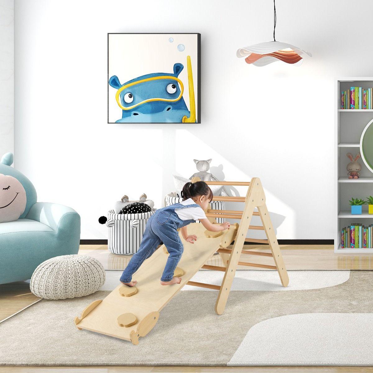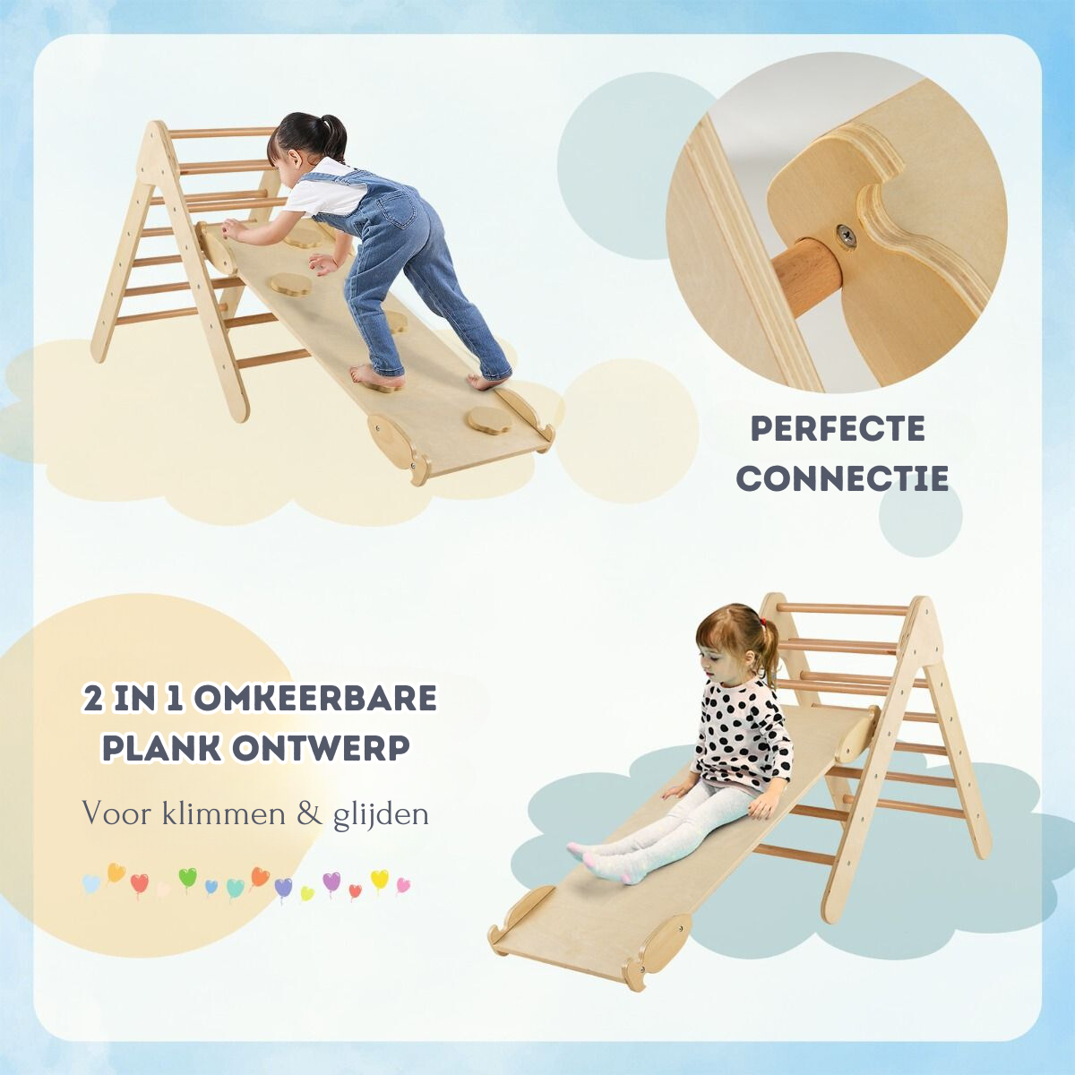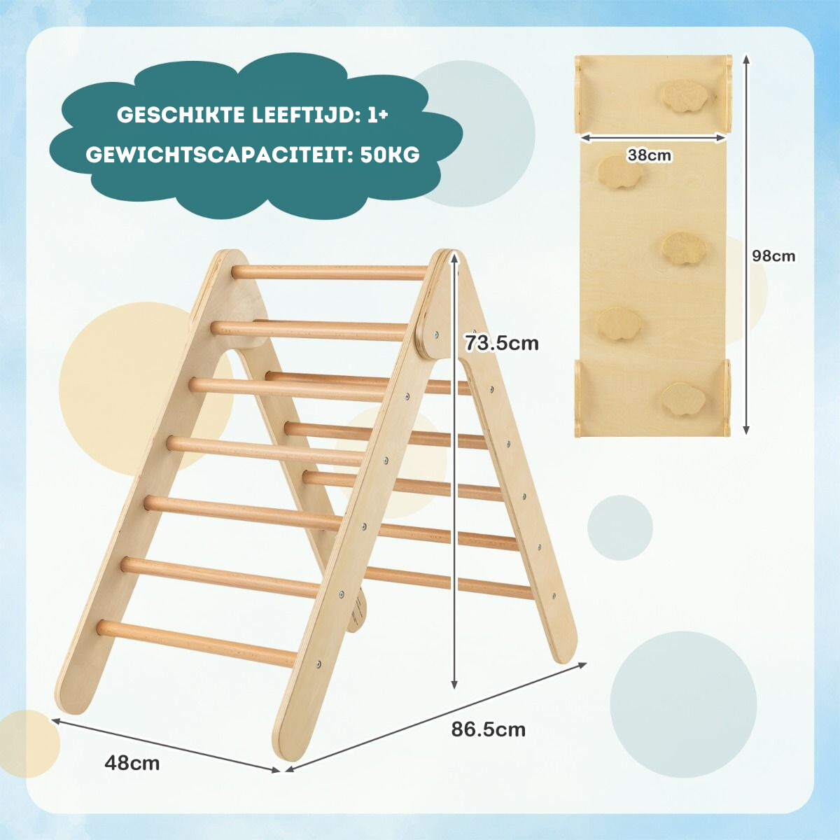 Laat deze houten klimdriehoek het nieuwe speelmaatje van je peuter worden! Met de verstelbare glijbaan en stevige constructie is dit speeltoestel veilig en duurzaam.