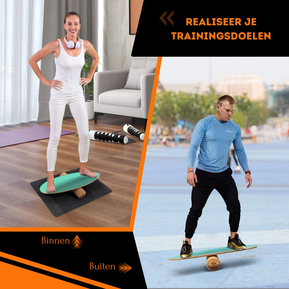 Train overal met de bijgevoegde Kurkrol balans board en viltmat.