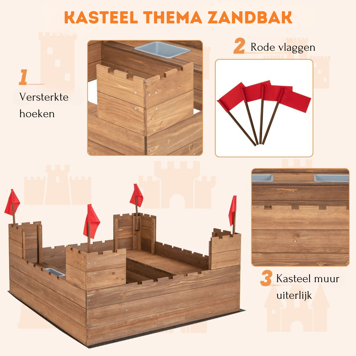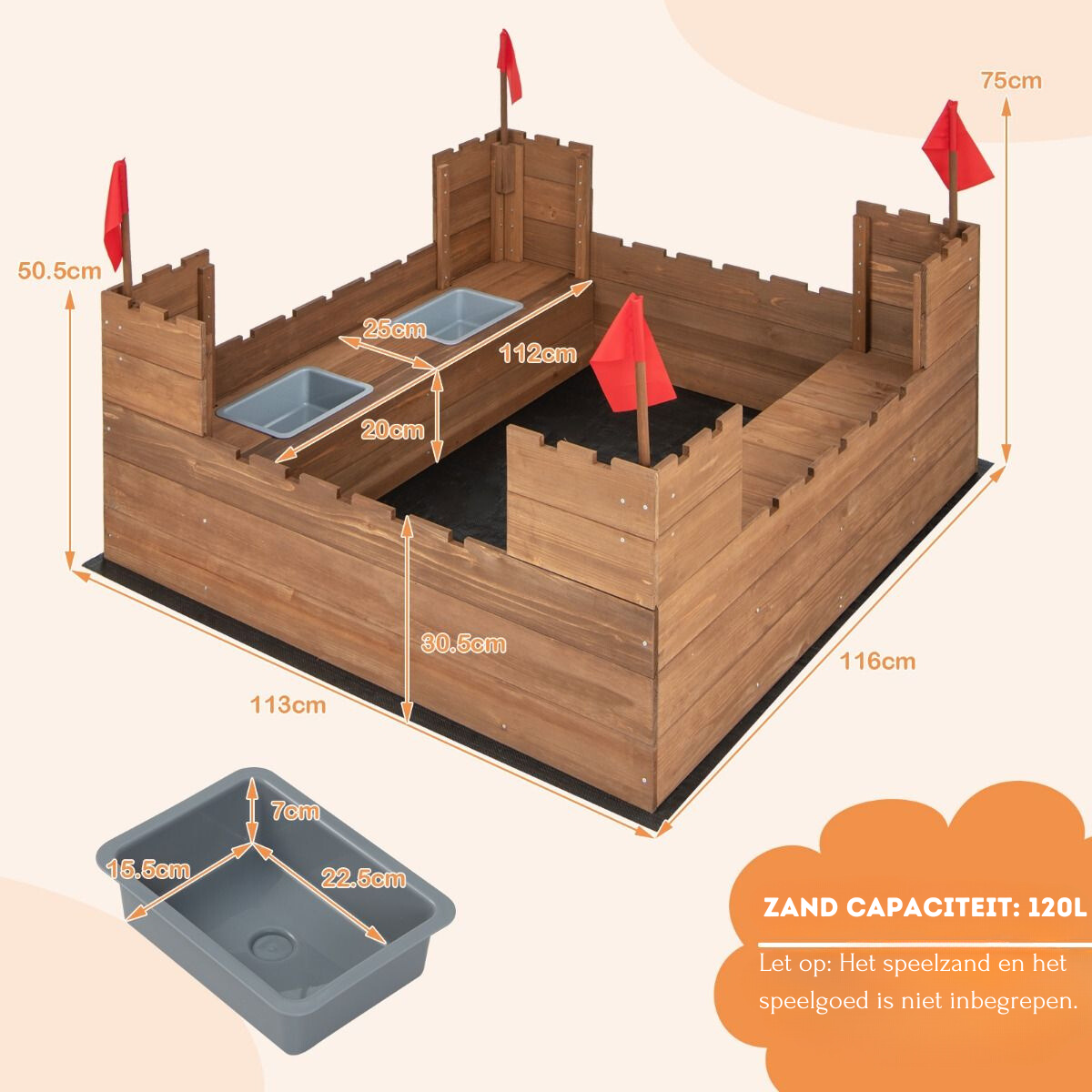- Het grote vestingsmotief van deze dennenhouten kasteel zandbak is perfect om de fantasie van je kinderen te stimuleren.