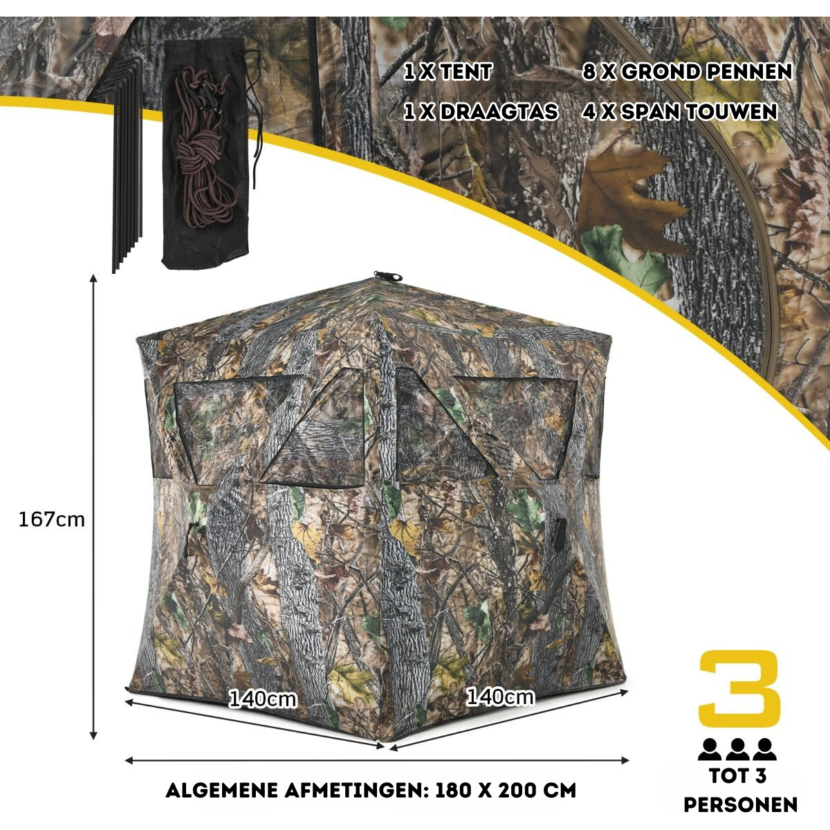3 personen tent: Ruim interieur en stevige structuur voor jachtcomfort. Camouflagetent vergroot jachtsucces.