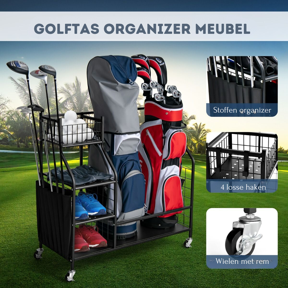 Inclusief extra opberg organizer voor golfclubs en golfvlaggen, en soepele verplaatsing met universele wielen.