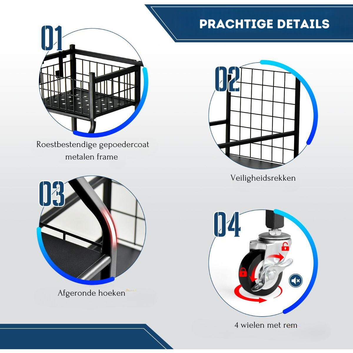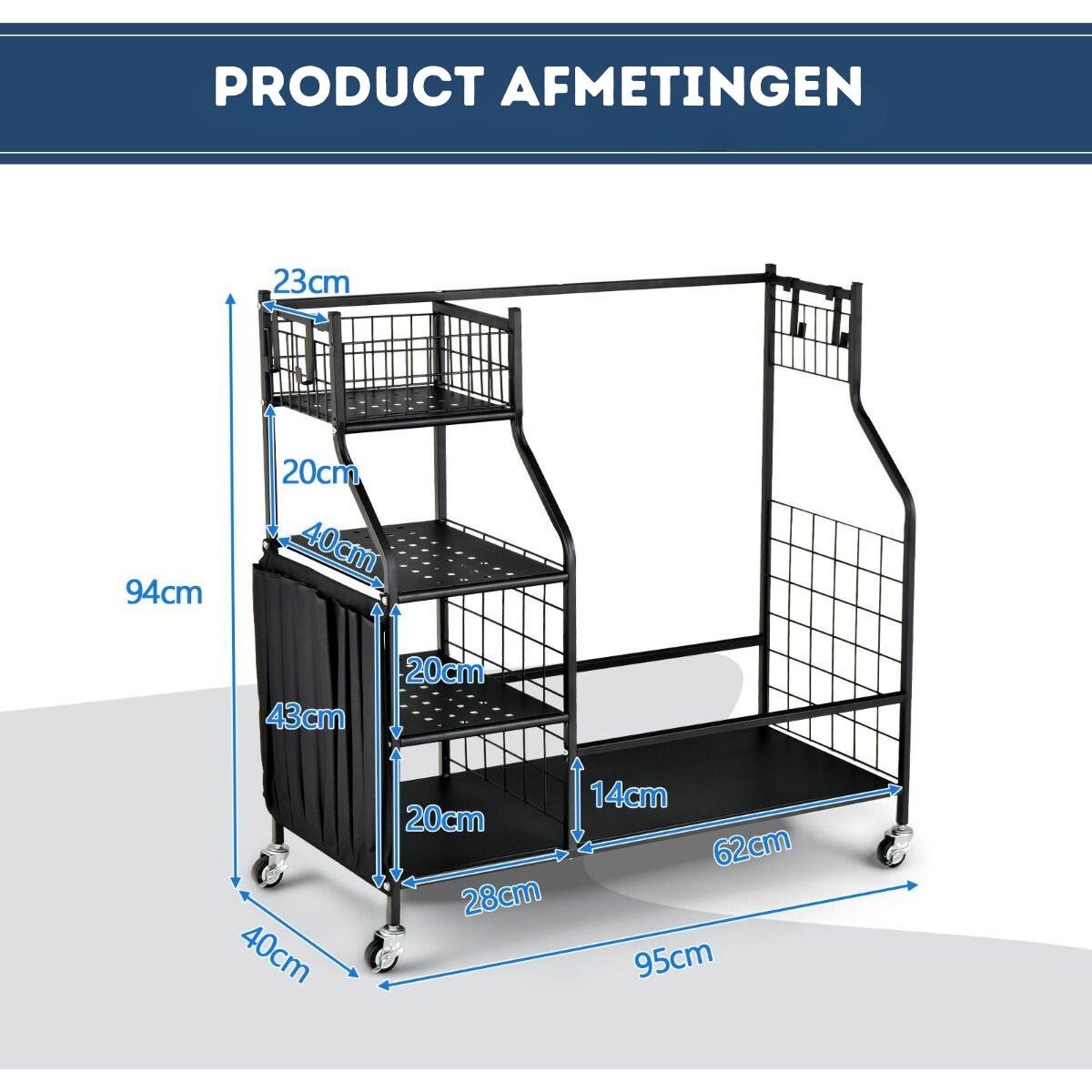 Met een mandje, 3 planken en 4 beweegbare haken voor al je golfaccessoires.