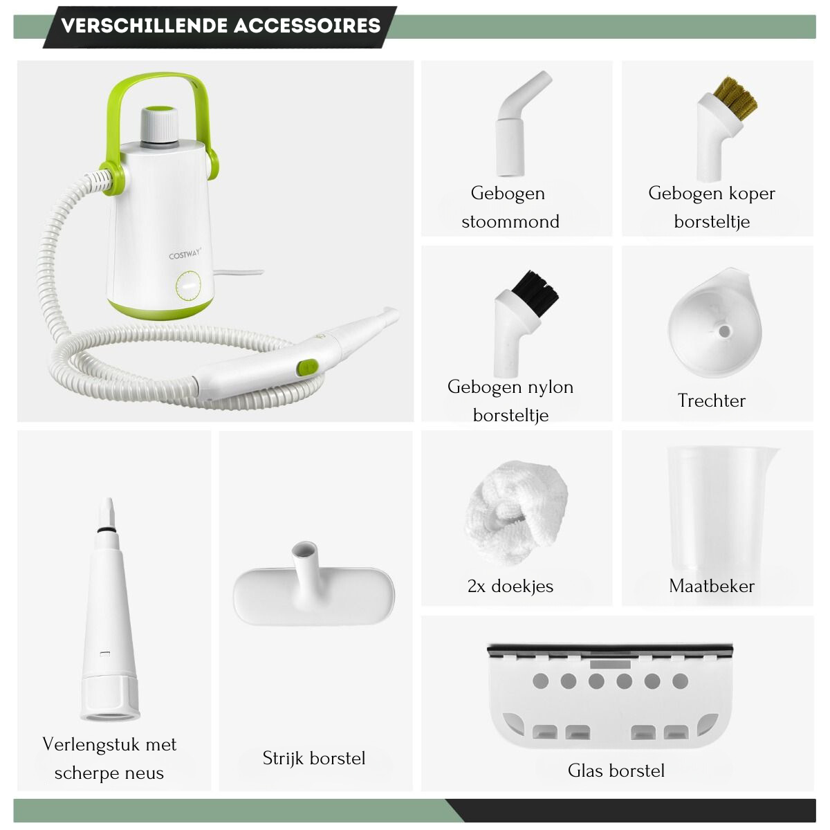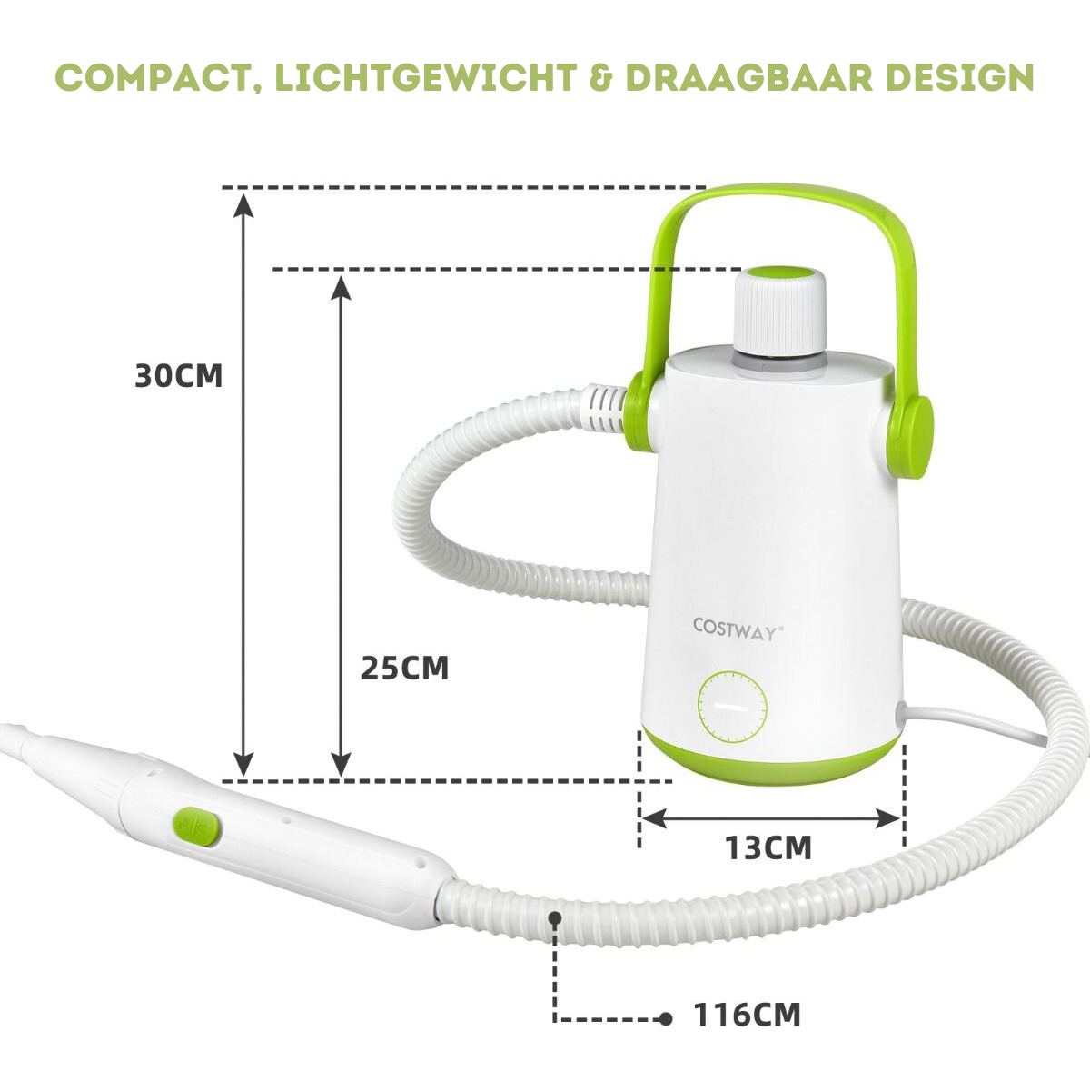 Wil je zonder moeite vet, vuil of bacteriën verwijderen van je bank, tapijt of raamkozijnen? De Costway handstoomreiniger van 1000W is jouw nieuwe schoonmaakhulp. Deze draagbare mini stoomreiniger levert tot 12 minuten krachtige stoom en wordt geleverd met een complete 10-delige accessoireset. Dankzij het lange snoer (3 m) en de flexibele slang (1 m) bereik je moeiteloos ook moeilijk toegankelijke plekken – volledig zonder chemicaliën.