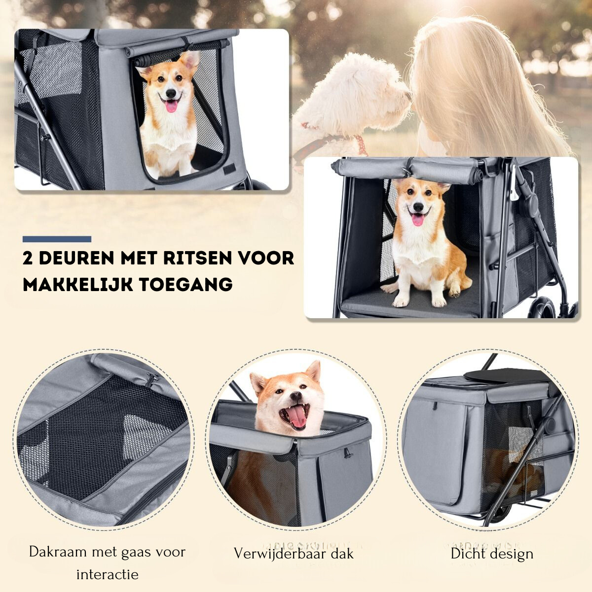 Ja, de hondenbuggy heeft 2 voor- en achterdeuren met rits voor gemakkelijke toegang. Daarnaast is er een bovenopening die open kan, zodat je huisdier van de omgeving kan genieten.