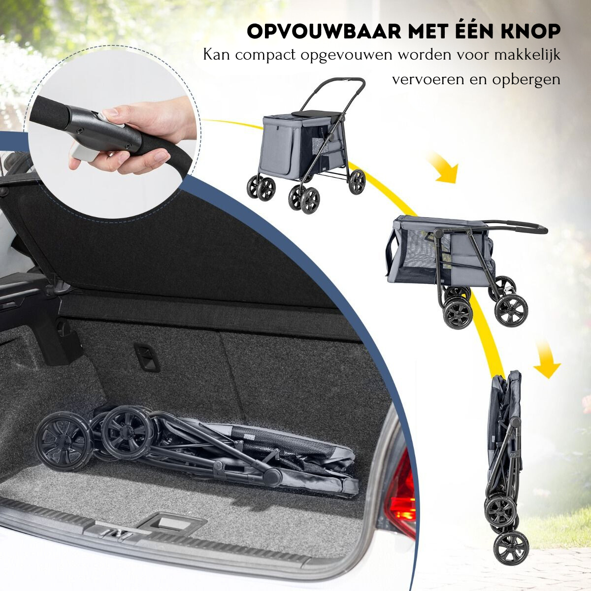 Handig opvouwbaar ontwerp: Met één druk op de knop kan de hondenbuggy compact worden opgevouwen voor gemakkelijke opslag en vervoer.