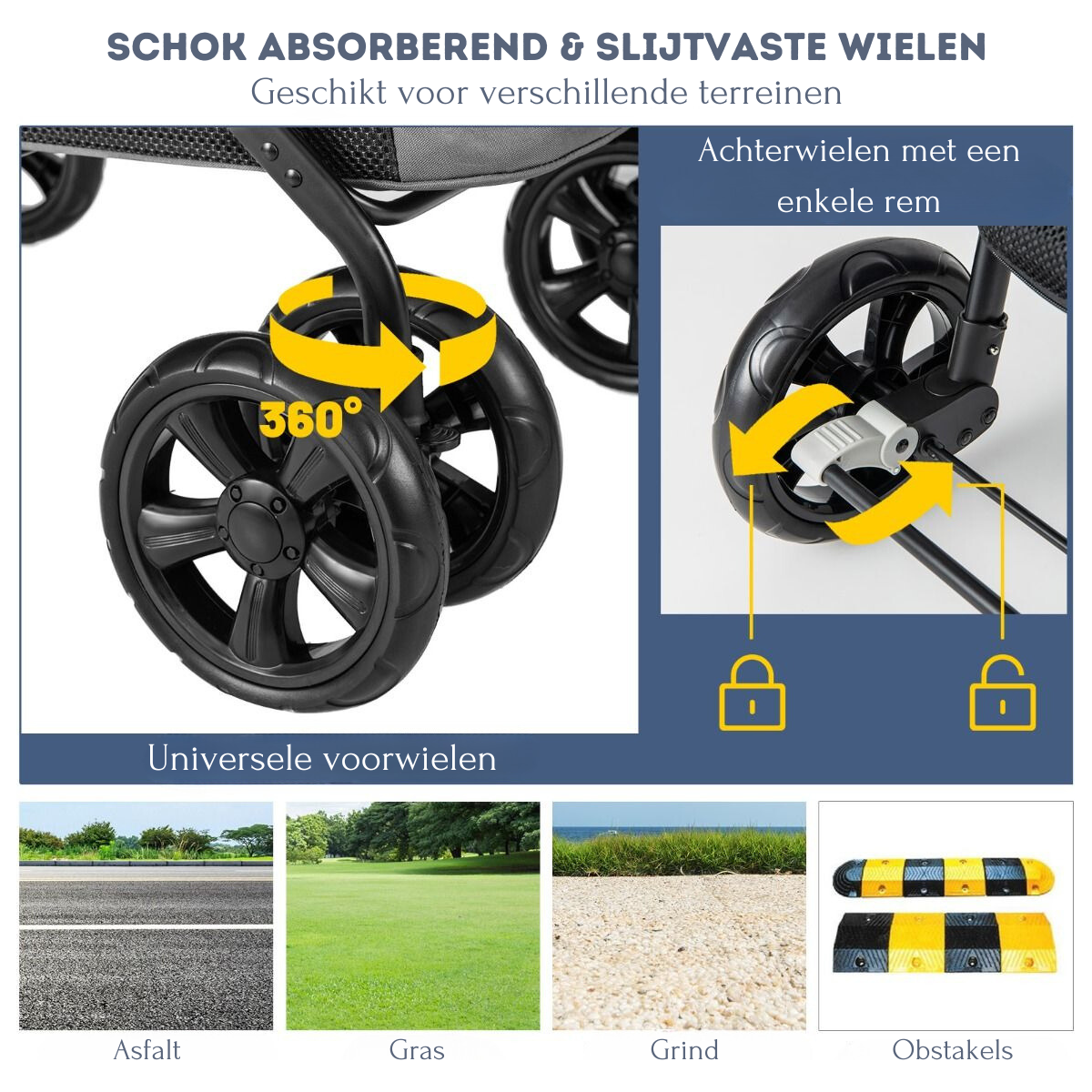 Soepele, schokdempende wielen: De wielen van onze hondenwagen zijn slijtvast en geschikt voor verschillende terreinen, met veilige remmen.
