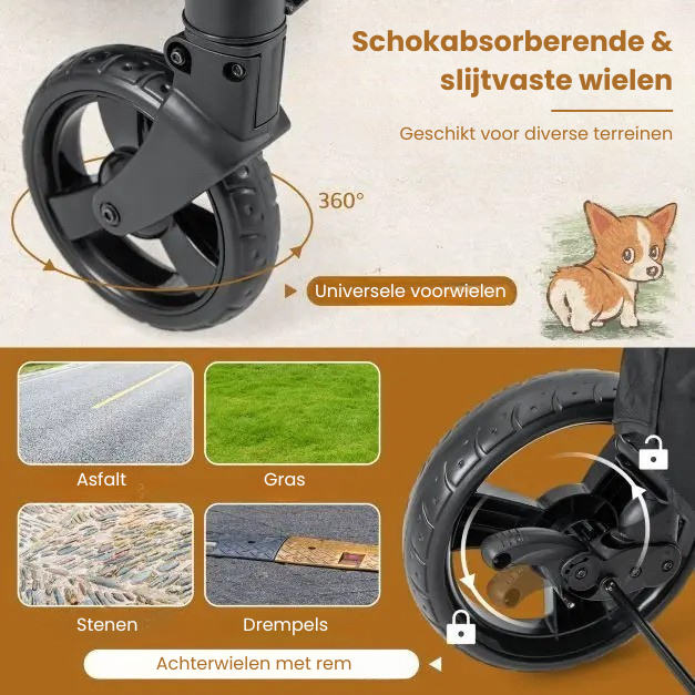 Ja, de 4-wiel hondenbuggy is voorzien van schokabsorberende wielen die zich aanpassen aan verschillende terreinen, zoals asfaltwegen, gras en grindwegen. Hierdoor biedt het een soepele en veilige rit voor je huisdier.