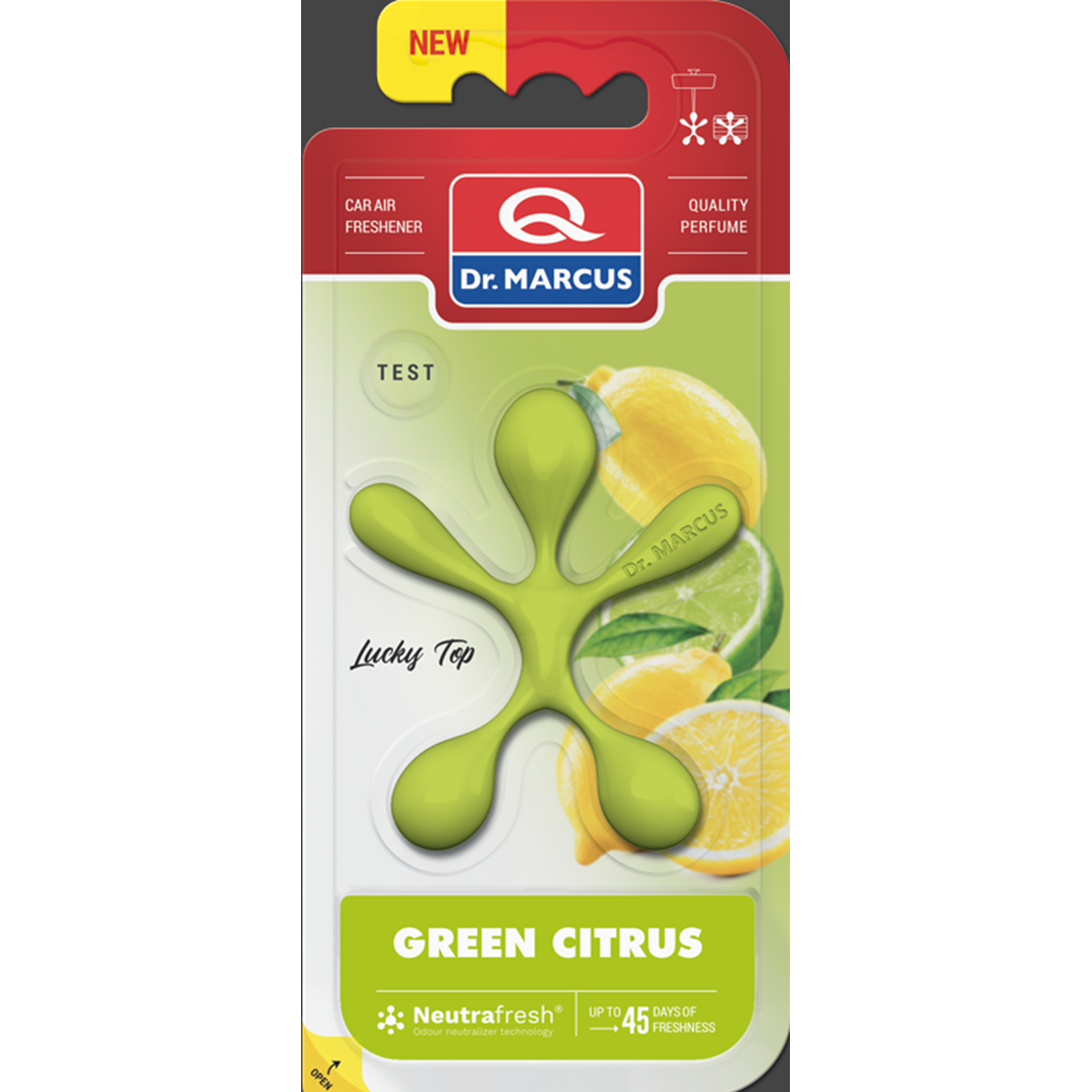 Met de Lucky Top Green Citrus luchtverfrisser van Dr. Marcus geniet je tot wel 45 dagen lang van subtiele en geruststellende aroma's tijdens elke autorit. Dankzij de neutrafresh technologie verspreidt deze luchtverfrisser continu een delicate geurervaring, waardoor elke reis aangenamer wordt.