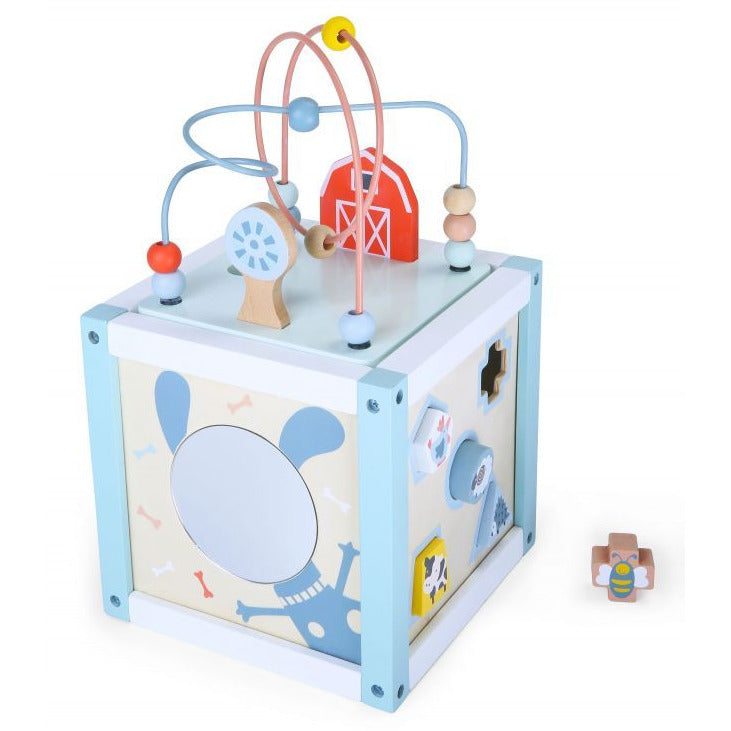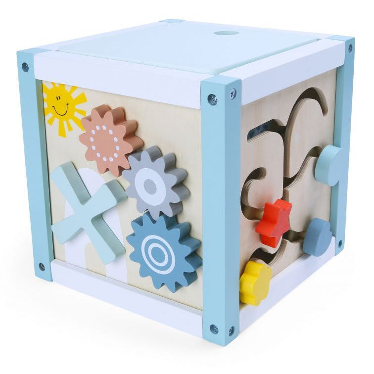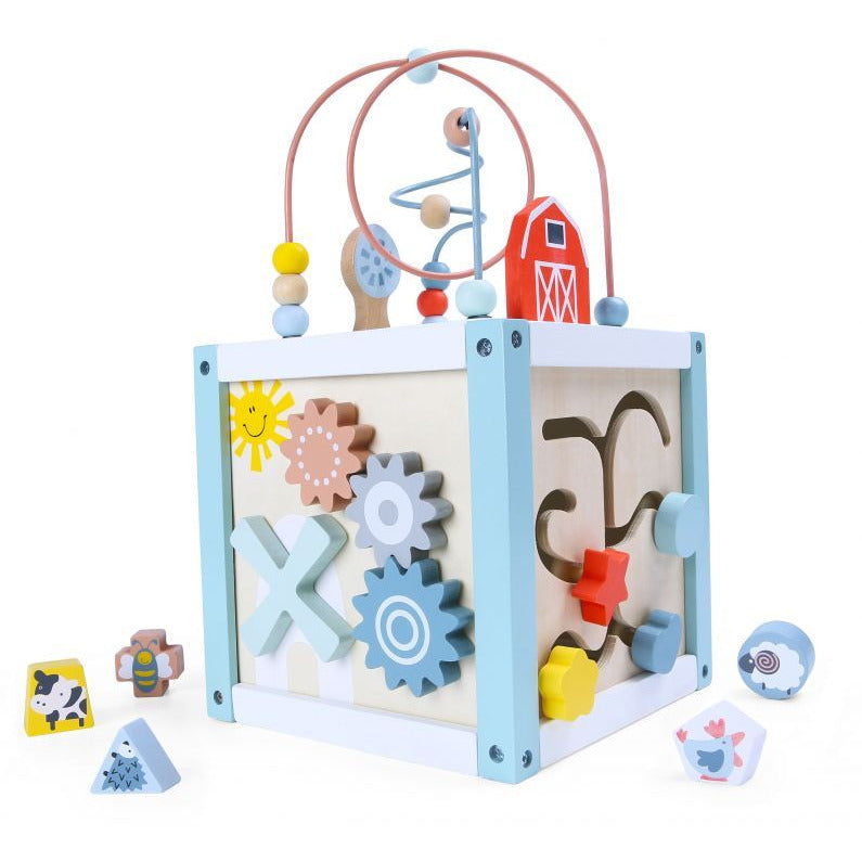 De kubussorteerder zit vol beweegbare elementen die het spel stimuleren en tegelijkertijd de vaardigheden van je peuter ontwikkelen. Het speelgoed leert kleur- en vormherkenning, bevordert motorische vaardigheden en zorgt bovendien voor veel plezier bij elk kind. Met een afneembaar deksel aan de bovenkant van de kubus, uitgerust met een doolhof en kleurrijke kralen, kan je kind ze van het ene uiteinde naar het andere verplaatsen. Aan de zijkanten van de kubus kan je peuter spelen met de sorteerder door de juiste vormen van de blokken te matchen. De andere zijden van de kubus hebben een spiegel, een labyrint en draaiende tandwielen.