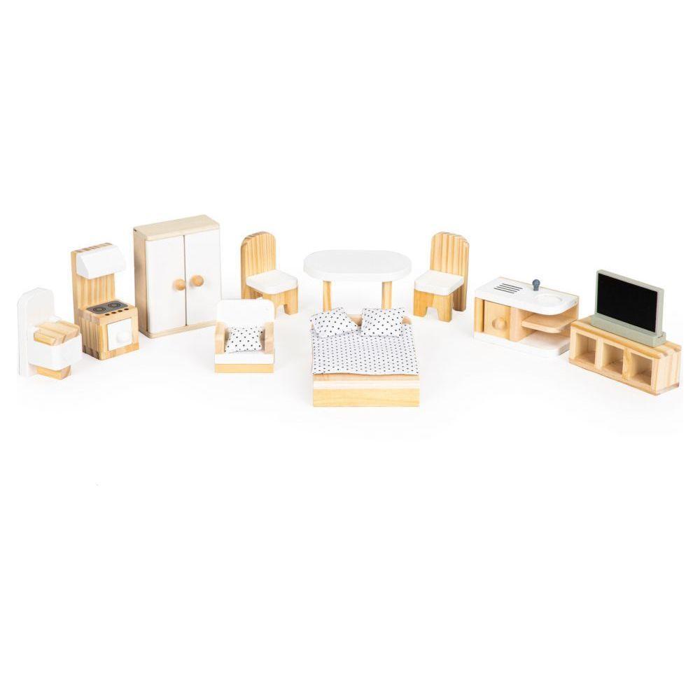 - Gemaakt van hout en wordt geleverd met een set van 10 kleurrijke meubels en accessoires.