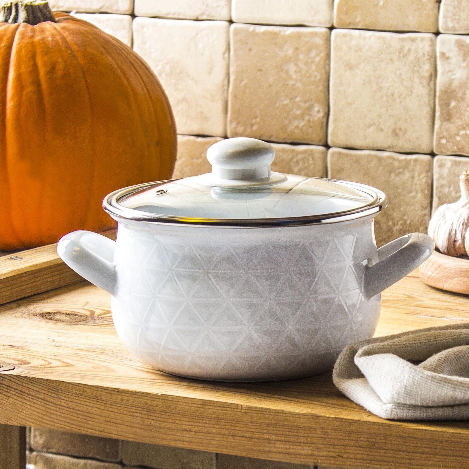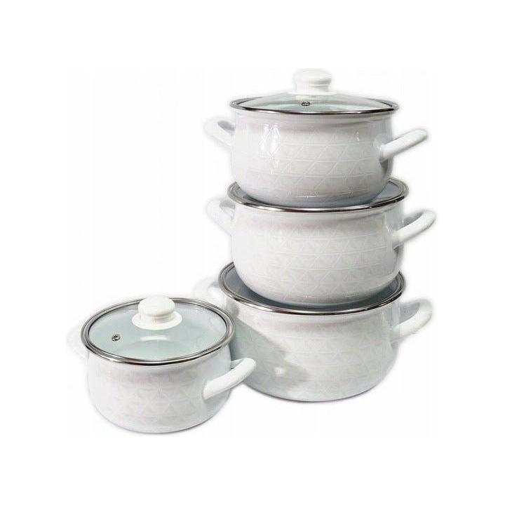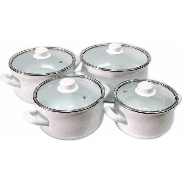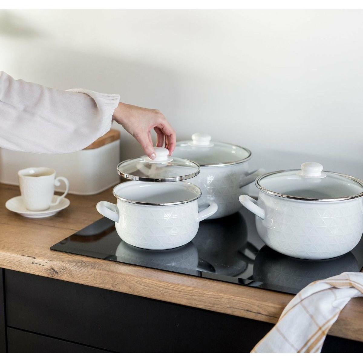 Met de Emalia Diamond kookpannenset (16, 18, 20 en 22 cm) heb je voor elke maaltijd de juiste pan in huis. De pannen zijn gemaakt van hoogwaardig koolstofstaal met duurzame emaille coating, waardoor ze krasbestendig, onderhoudsvriendelijk en veilig zijn in gebruik. Het subtiele diamantpatroon in wit emaille geeft je keuken een stijlvolle, retro uitstraling. Dankzij de gladde emaille binnenkant kook je gezond: er komen geen schadelijke stoffen in je eten terecht. Inclusief geharde glazen deksels met stoomontluchting – ideaal om tijdens het koken je gerechten in de gaten te houden.