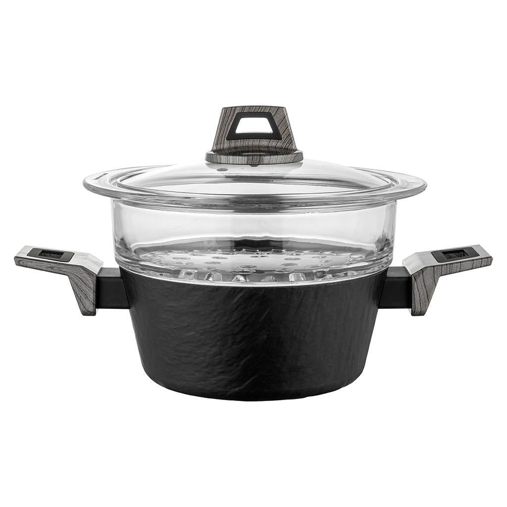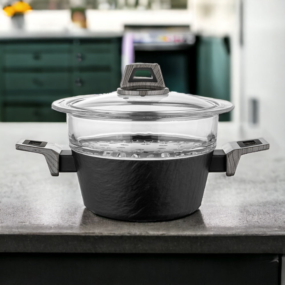 Hittebestendig glazen inzet met Soft Touch-handvat: De stoompan wordt geleverd met een glazen inzet en een comfortabel handvat dat niet warm wordt, waardoor je de pan veilig kunt optillen en verplaatsen.