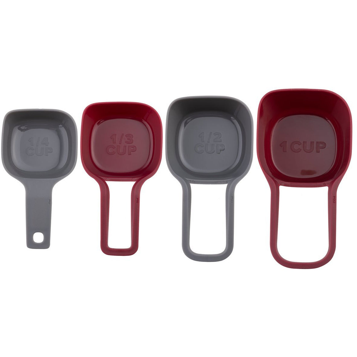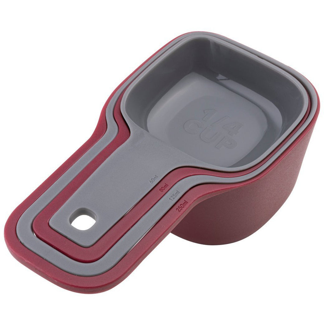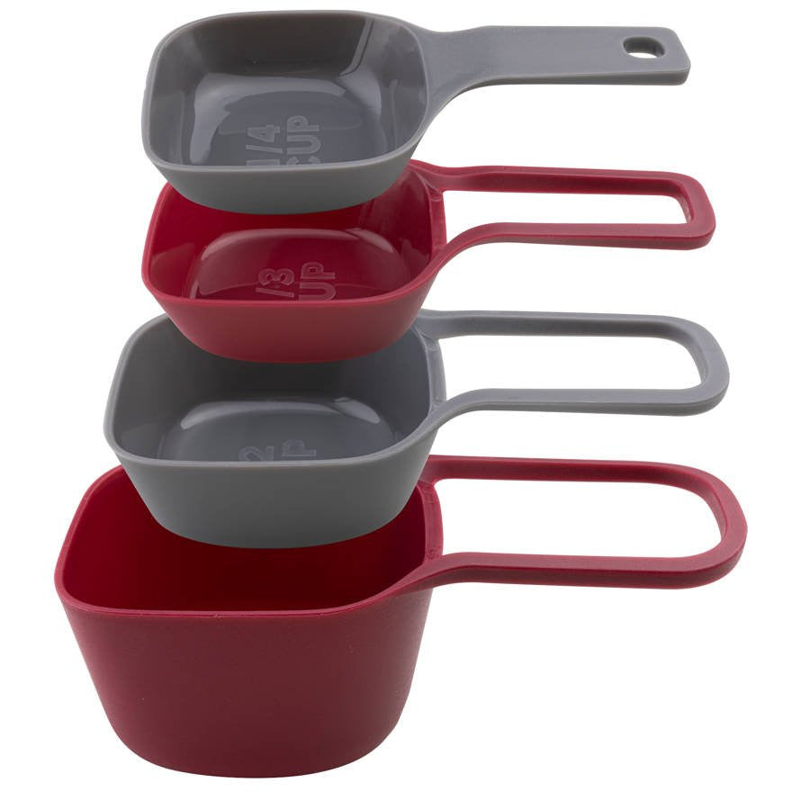 Je ontvangt 4 maatcupjes. De cups zijn namelijk in verschillende afmetingen uitgevoerd en passen perfect in elkaar. Zo ervaar je nooit het probleem dat je maatlepels los in je kast zwerven of dat je een bepaalde afmeting cup kwijt bent. Je pakt één cup en je hebt er tegelijkertijd vier. Na het gebruik maak je ze schoon en klik je ze gewoon weer in elkaar van groot naar klein. Deze maatcups zijn daarom zeer gemakkelijk in gebruik. Bovendien mogen ze gezien worden. Er zijn namelijk twee maatcups in rode kleur en twee maatcups in een mooie grijze kleur. De vorm is vierkant met afgeronde hoeken en de gehele set aan maatlepels heeft door de vormgeving en de kleur een retro uitstraling van de jaren 50. Super trendy!