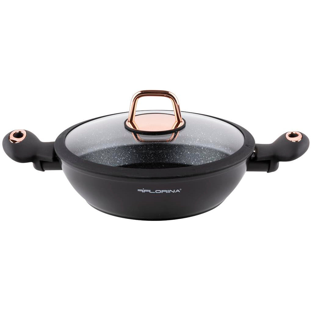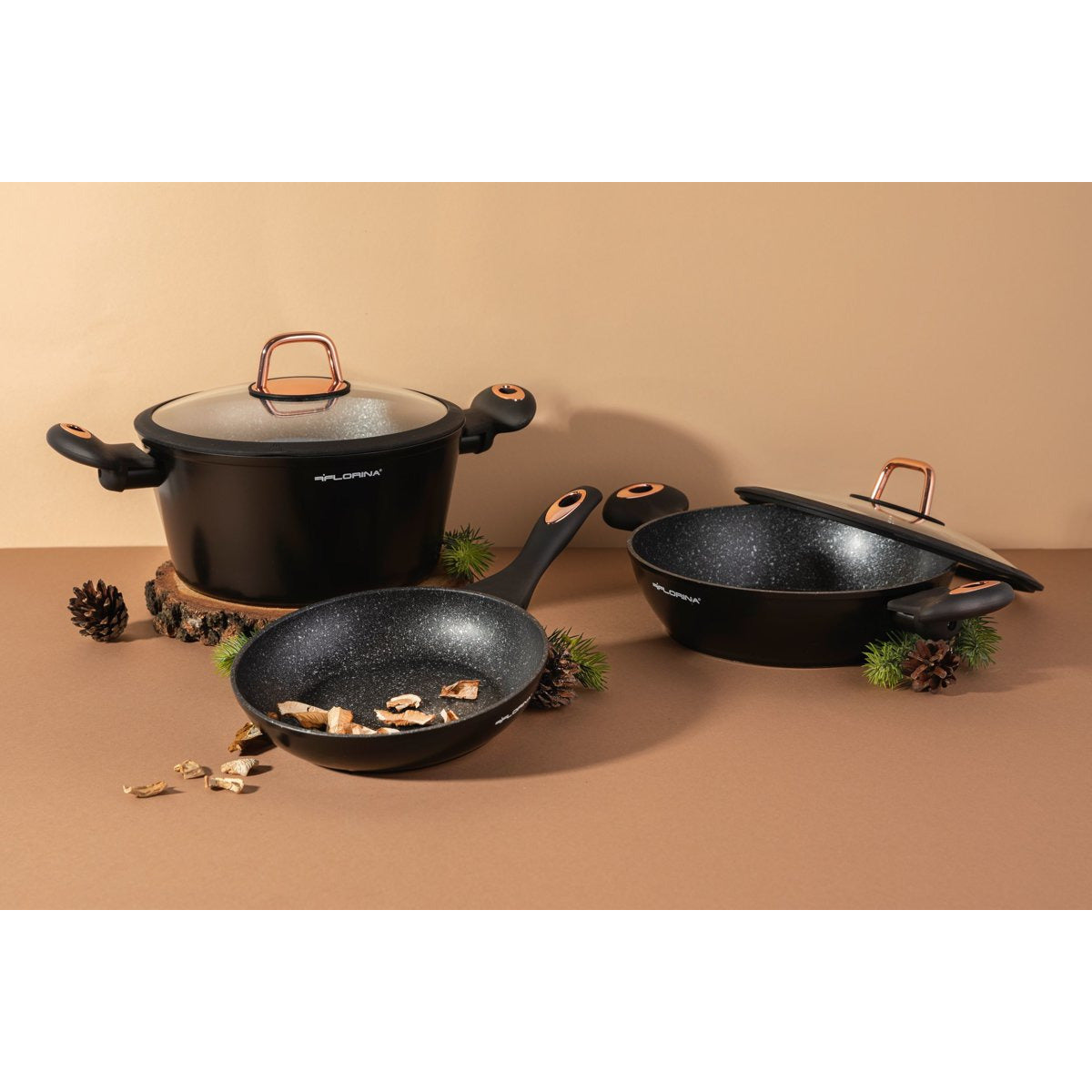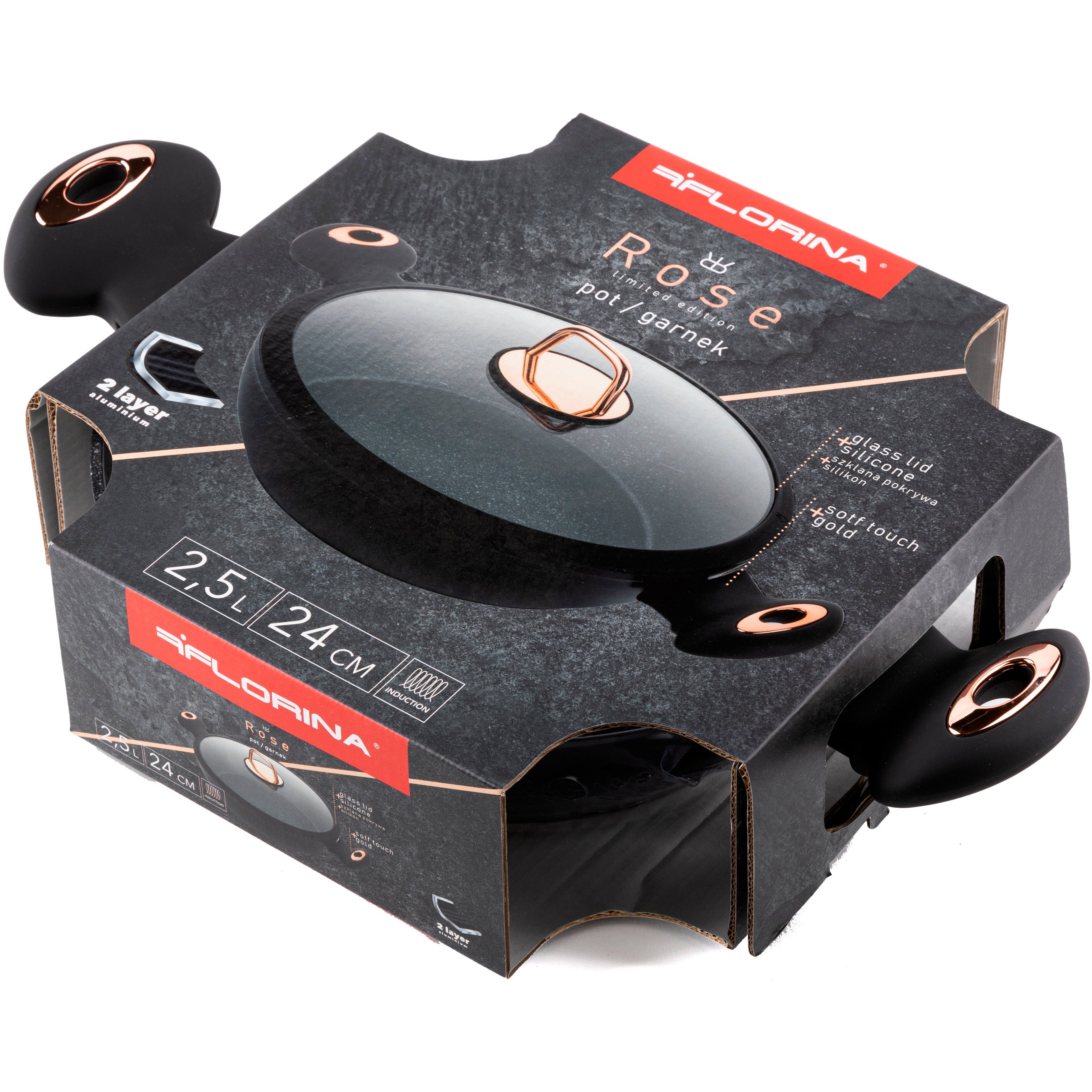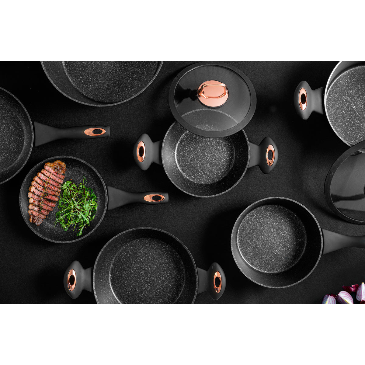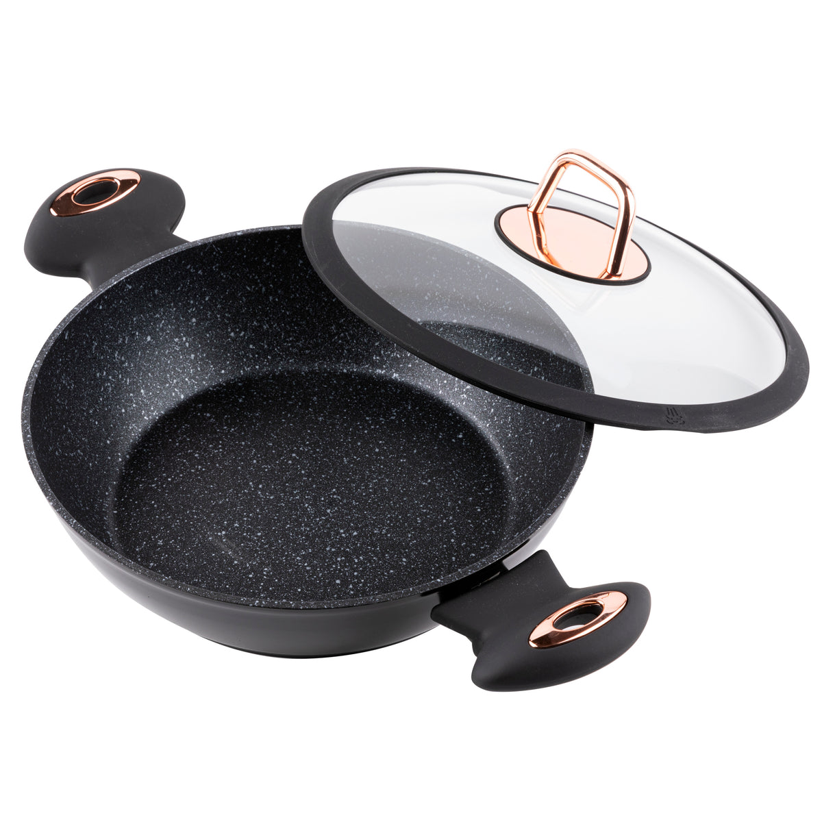 Bent u opzoek naar een nieuwe kookpan / braadpan? De Rosé Limited Edition is niet alleen prachtig om te zien maar kan ook gebruikt worden op alle warmtebronnen zelfs inductie. Deze luxe pan is dus geschikt voor elke keuken.Hoogwaardige materialenDe aluminium Rosé pan is voorzien van een 2 laags keramische coating wat bestand is tegen hoge temperaturen en daardoor dus niet verkleurd. Door de antiaanbaklaag kunt u koken met weinig olie of vet en blijft het niet snel plakken op de bodem. De handvaten zijn gemaakt met een soft touch coating wat zacht aanvoelt bij gebruik en zijn gemaakt van bakeliet wat koel blijft bij hoge temperaturen zodat jij je vingers niet verbrandt.KleurDe Rosé pan heeft een zwarte kleur met rosé gouden accenten. Deze combinatie geeft de pan een luxe uitstraling en is het geen straf om hem op je aanrecht te laten staan.