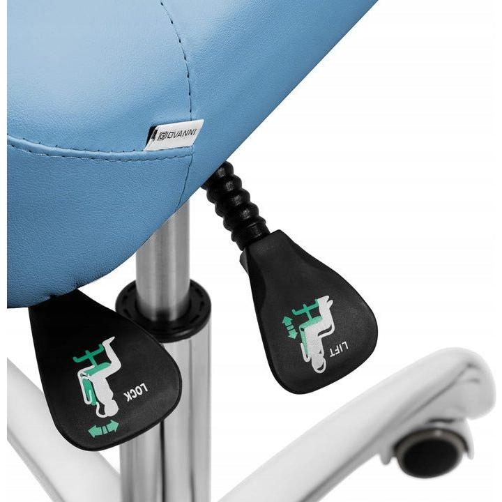 Ben je op zoek naar een comfortabele en ergonomische kruk voor je werk als pedicure, schoonheidsspecialist of podoloog? Dan is de Giovanni Ergonomische Cosmetische Zadelkruk met Rugleuning in het blauw de perfecte keuze voor jou. Met een verstelbare hoogte en rugleuning, stabiliteit en mobiliteit, en hoogwaardige bekleding, biedt deze kruk optimale ondersteuning en comfort tijdens je dagelijkse werkzaamheden. Maak je werk gemakkelijker en plezieriger met deze blauwe zadelkruk van Giovanni.
