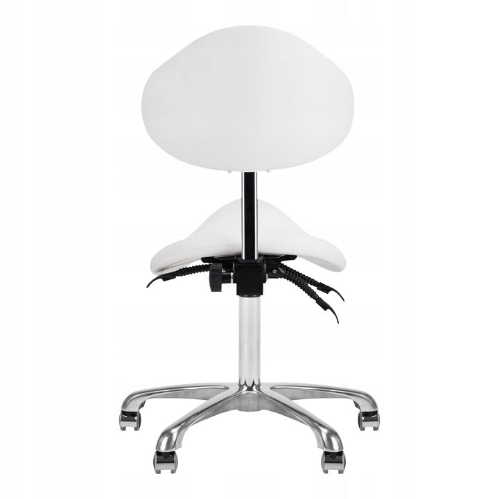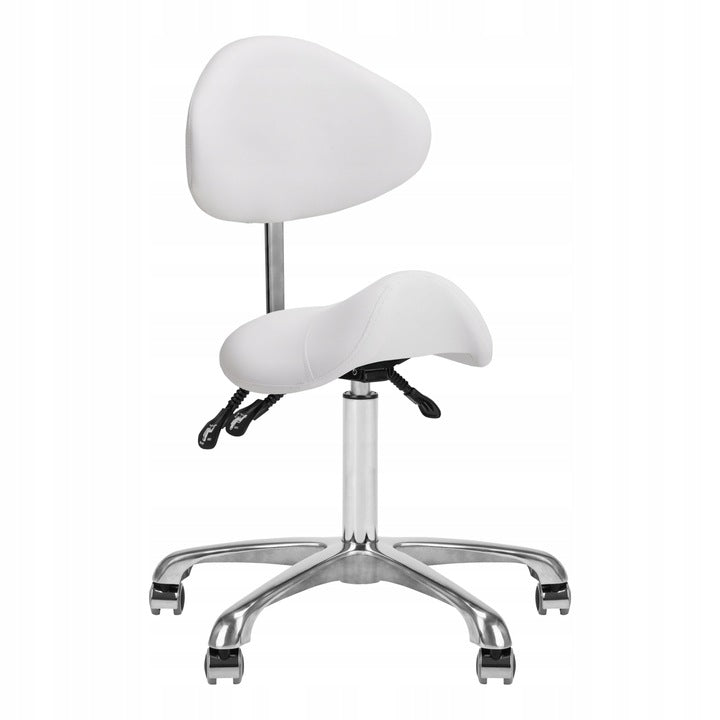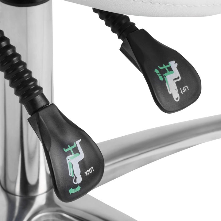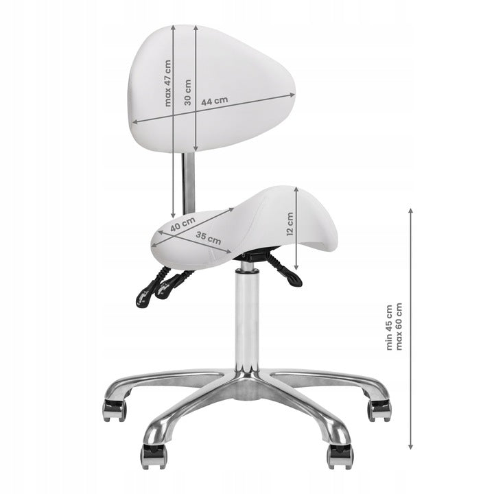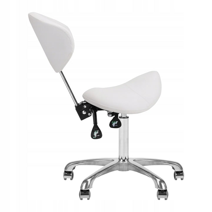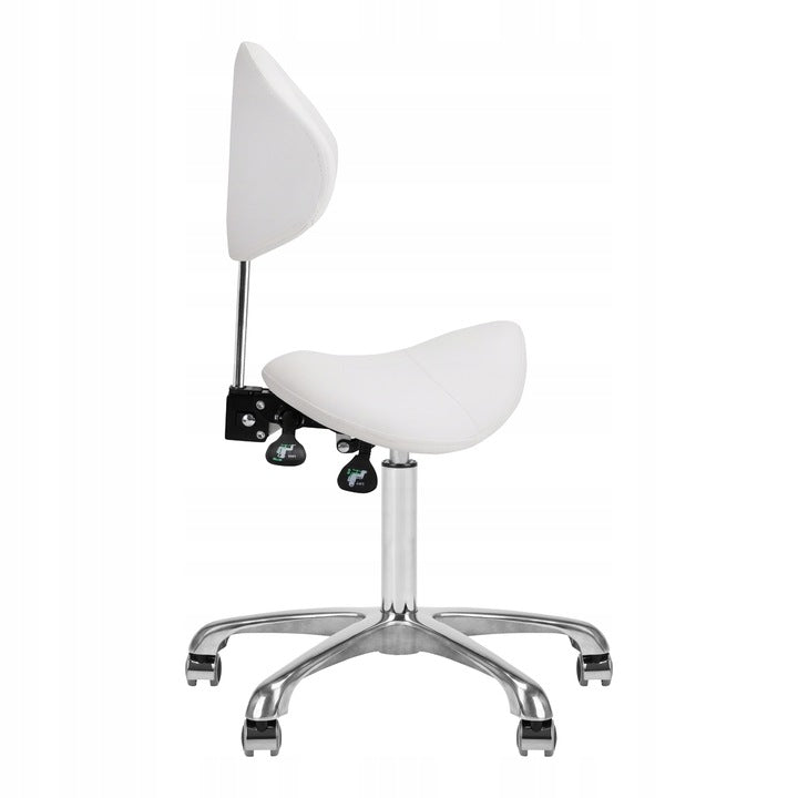 Podologie kruk: De rugleuning van deze kruk is tot 20 cm in hoogte verstelbaar voor extra ondersteuning.