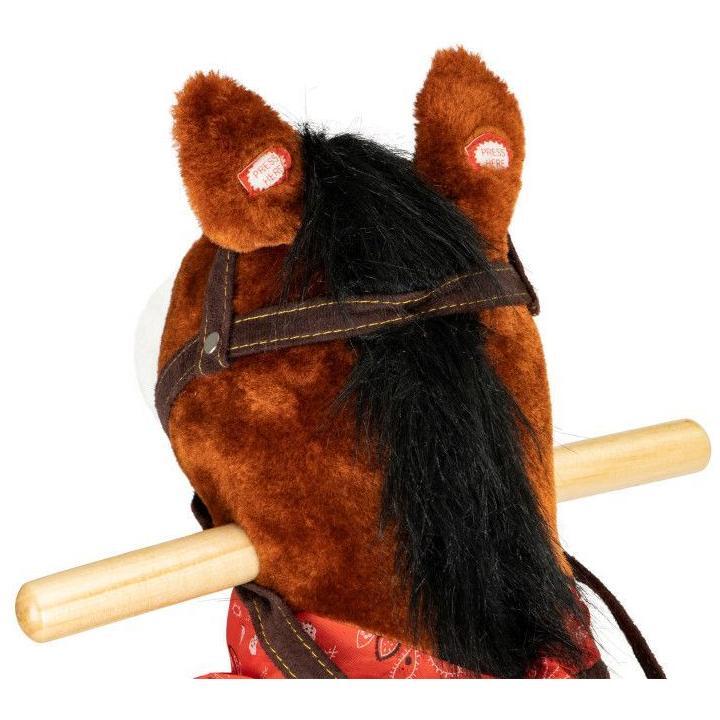 Het paard heeft een bewegende staart en maakt paardengeluiden uit de snuit. Door simpelweg op het knopje tussen zijn oren te drukken, begint de staart vrolijk te kwispelen en wordt het spelen met dit hobbelpaard nog leuker. Kortom, dit houten hobbelpaard is het perfecte cadeau voor opgroeiende peuters die van avontuur houden en willen hobbelen op hun eigen stoere paard!
