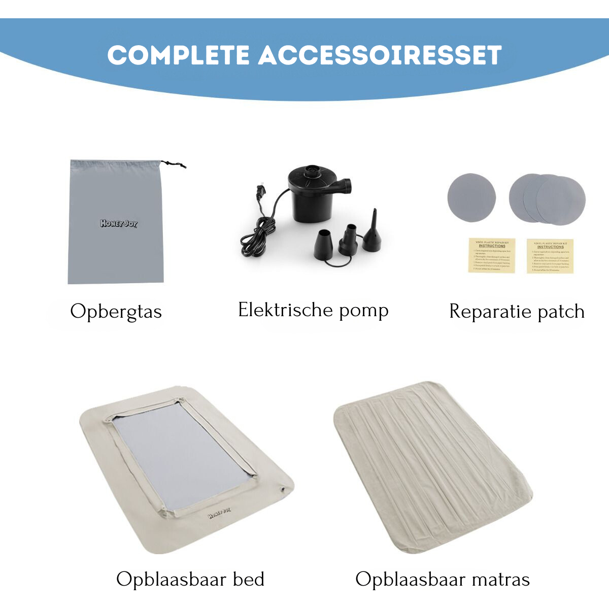 Inbegrepen: 1x Honeyjoy peuter luchtbed, 1x pomp, 1x reparatieset