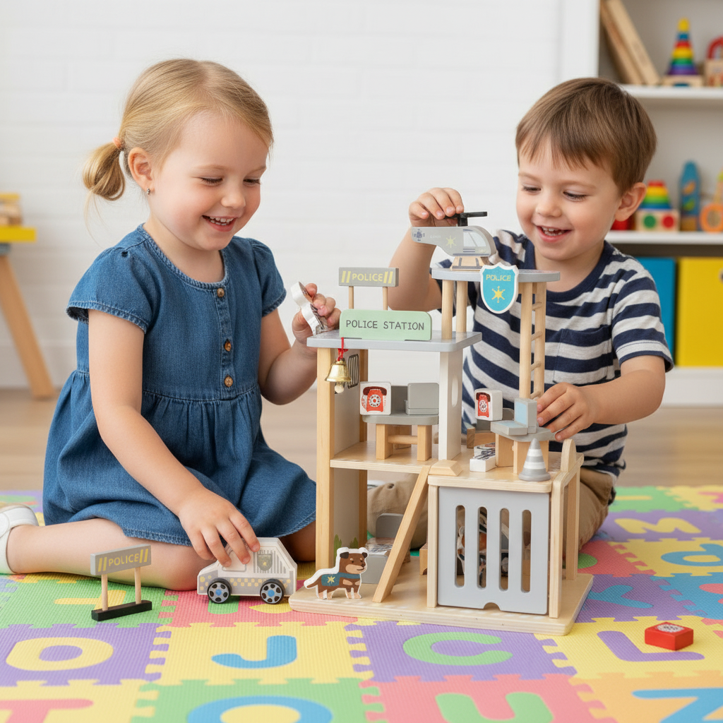 Met dit educatieve houten politiebureau in Montessori-stijl ontdekken kinderen spelenderwijs de wereld van politie en hulpdiensten. Duurzaam, veilig en eindeloos leerzaam – een cadeau waar ze jarenlang plezier van hebben.