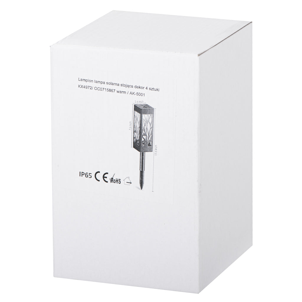 De set tuinverlichting bevat 4 stuks decoratieve zonnelantaarns, inclusief lange standaards die in de grond kunnen worden gereden voor eenvoudige plaatsing.