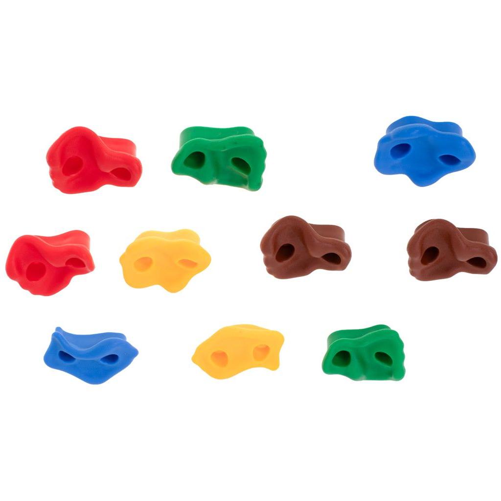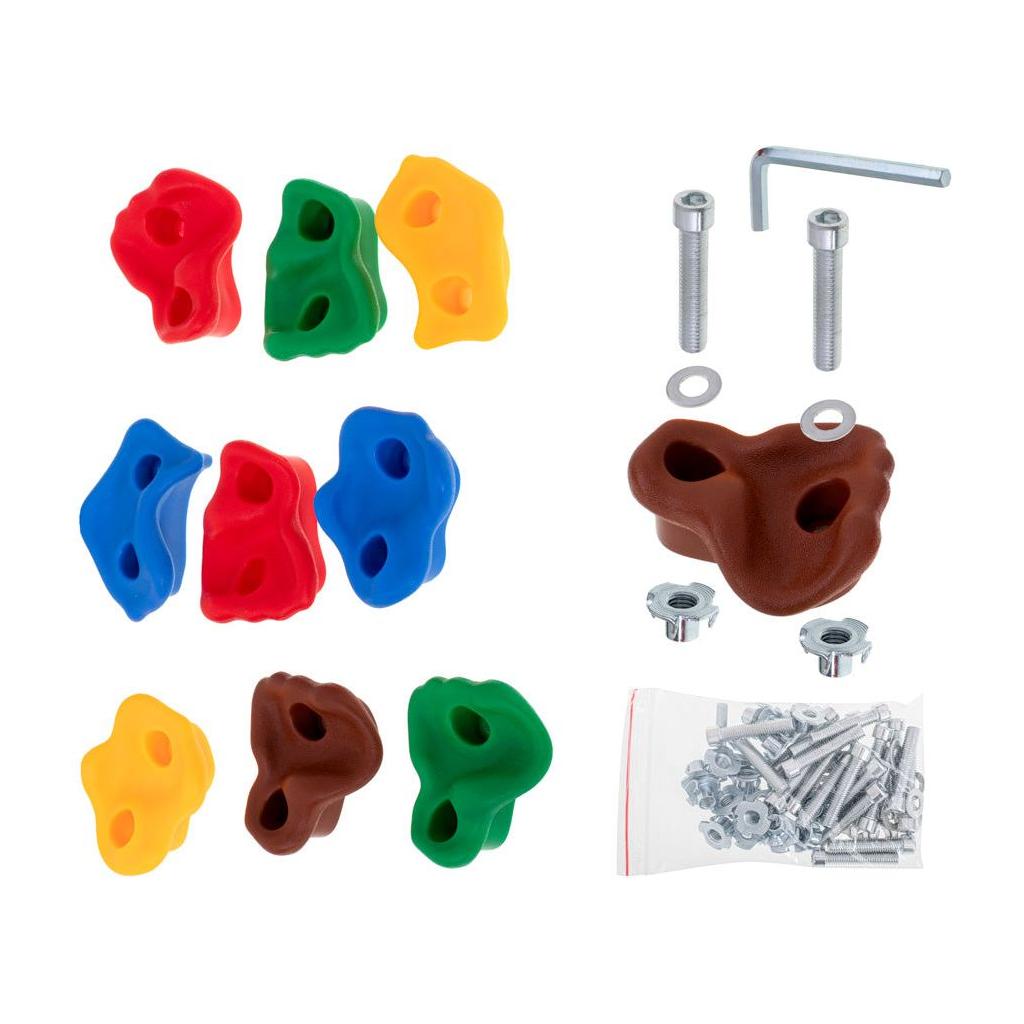 Het oppervlak van de handgrepen is ruw, wat de grip verbetert, zelfs als je handen nat of vuil zijn! De stenen hebben verschillende vormen en zijn elk ongeveer 10 cm breed, waardoor de klimmende persoon een comfortabele en veilige grip heeft! Wat ook heel belangrijk is, ze hebben geen scherpe randen.