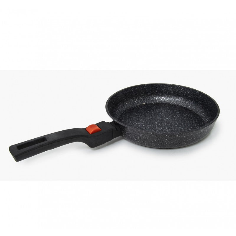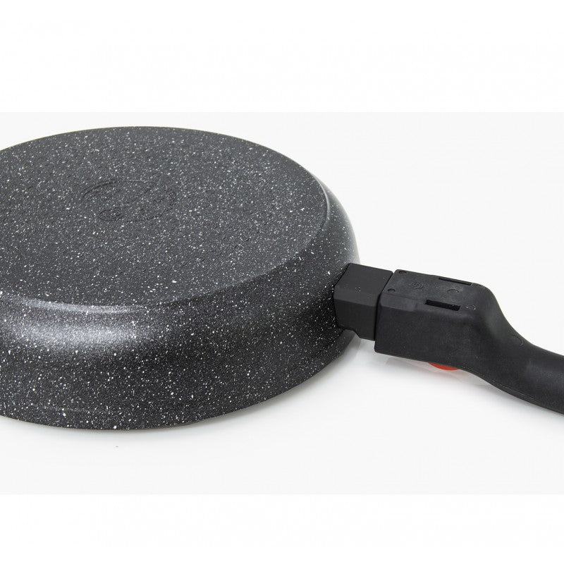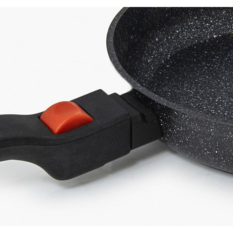 De pan is voorzien van een 5-laagse krasvaste antiaanbaklaag, die je laat koken met weinig tot geen vet. Dankzij het afneembare handvat is hij makkelijk op te bergen én vaatwasserproof (alleen de pan). Gemaakt van gerecycled aluminium, volledig vrij van schadelijke stoffen, en geschikt voor alle warmtebronnen, inclusief inductie.
