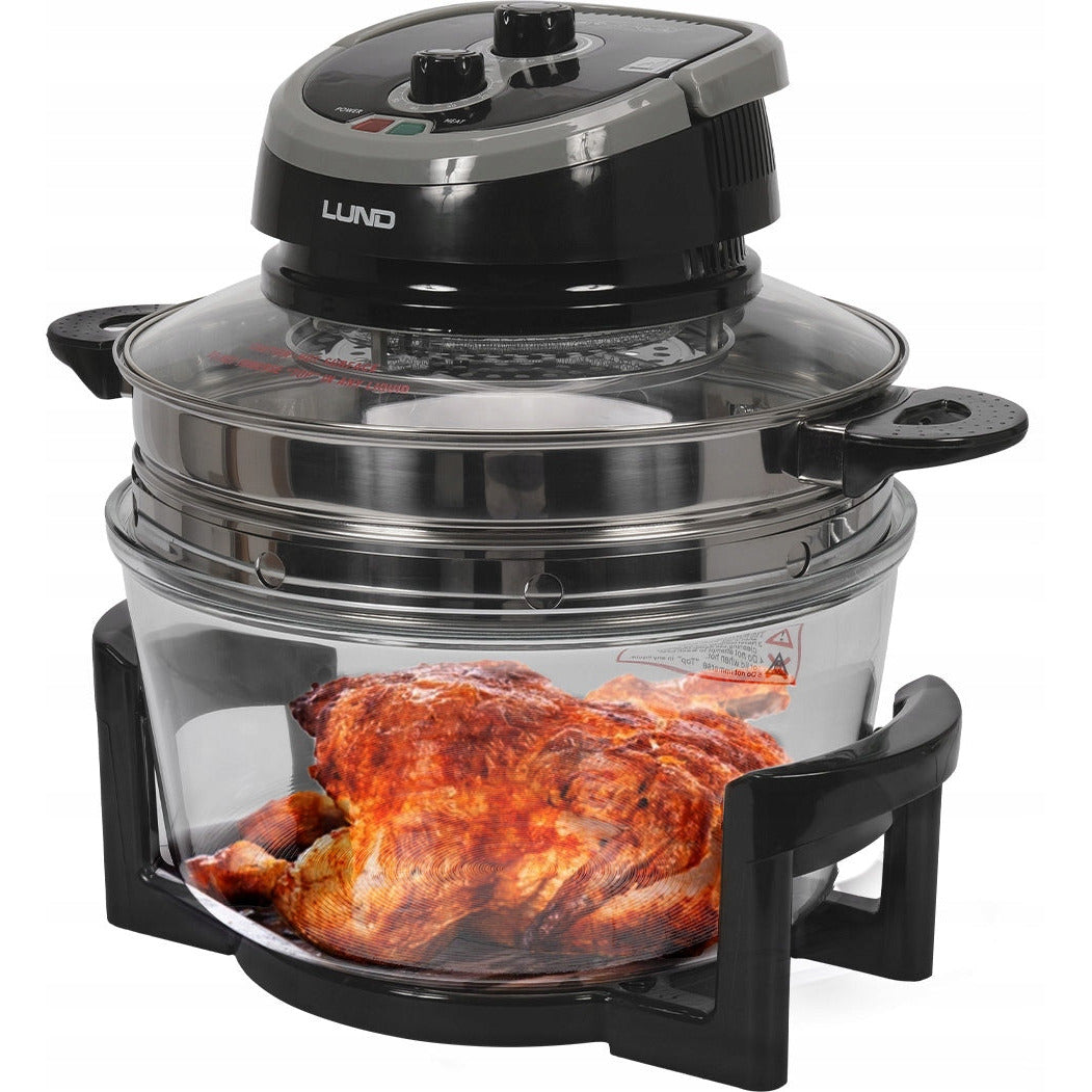 Bent u opzoek naar een multifunctioneel apparaat voor in de keuken dat kan bakken, koken, grillen en veel meer? Met deze heteluchtoven van LUND is voedsel bereiden op een gezonde manier een simpel klusje. Door het gebruik van halogenen en circulerend lucht bakt de halogeenoven 3 tot 5 keer sneller dan een traditionele oven en biedt het een vetarme en gezonde voedselbereiding. De vitaminen en voedingsstoffen blijven behouden en worden gekookt zonder olie en vet. Door de meegeleverde ophoogring vergroot je de inhoudt met maar liefst 5 liter waarmee het totaal op 17 liter komt, dit is genoeg om eten te bereiden voor het hele gezin. Met de timer die je kunt instellen van 0 tot 60 minuten zal het ook makkelijk zijn om gerechten de juiste tijd te geven om te garen.