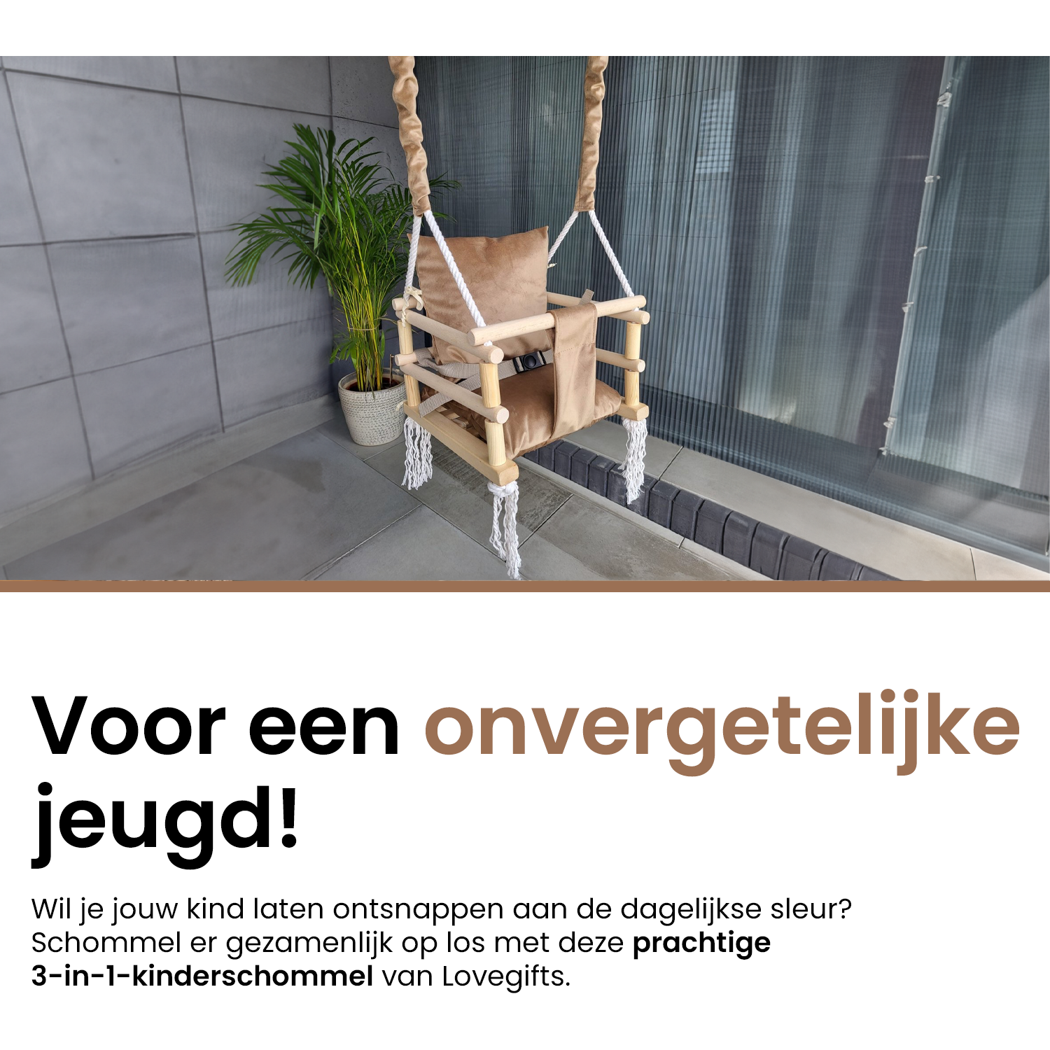 Wil je jouw kind laten ontsnappen aan de dagelijkse sleur? Schommel er gezamenlijk op los met deze prachtige 3-in-1-kinderschommel van Lovegifts. Onze schommel ondersteunt tot wel 25 kilo, dus je kind zal er jarenlang plezier van kunnen hebben. Het prachtige ontwerp van deze schommel is natuurlijk niet te missen. De schommel is een ware eyecatcher en nog comfortabel ook, waardoor zowel jij als je kind blij zullen zijn.