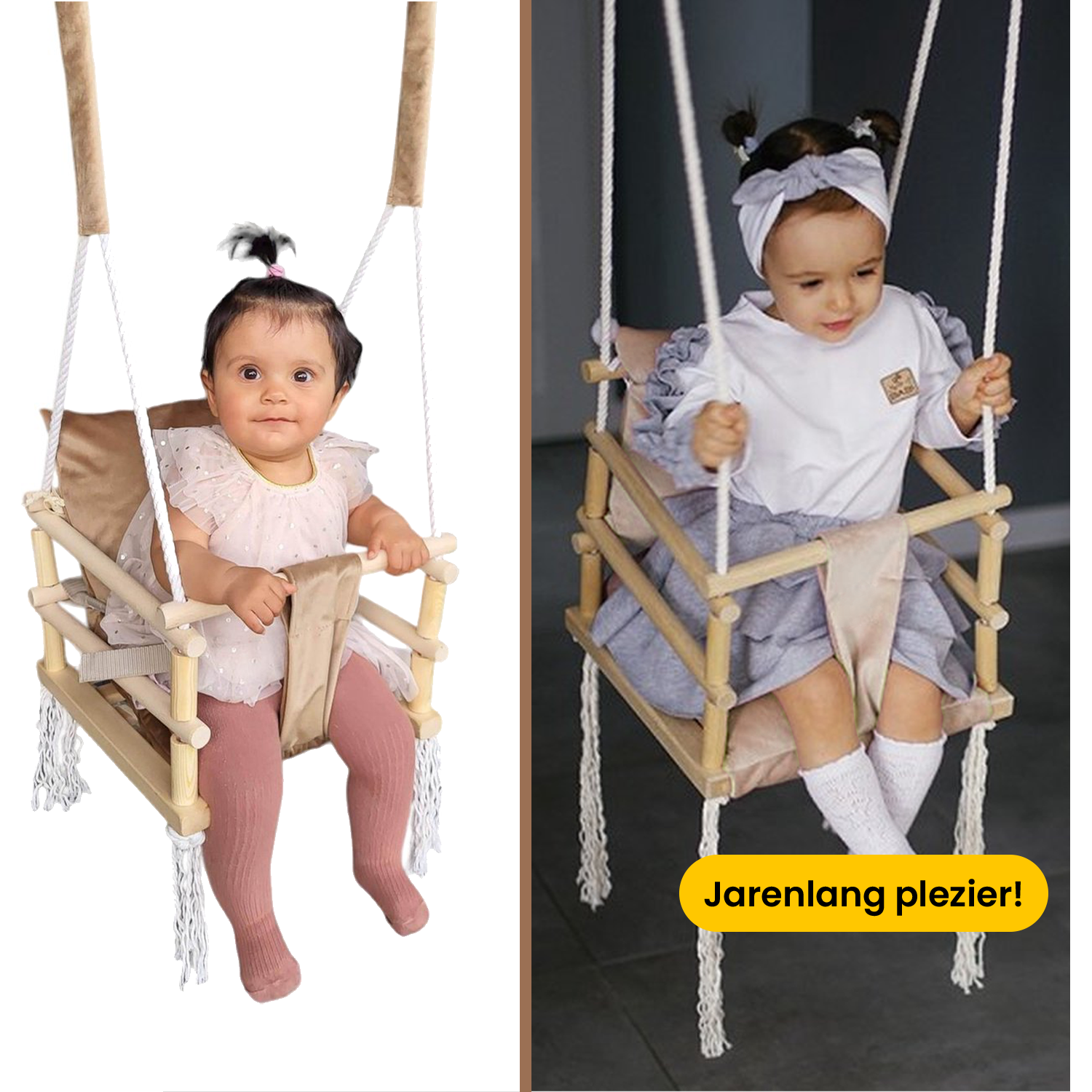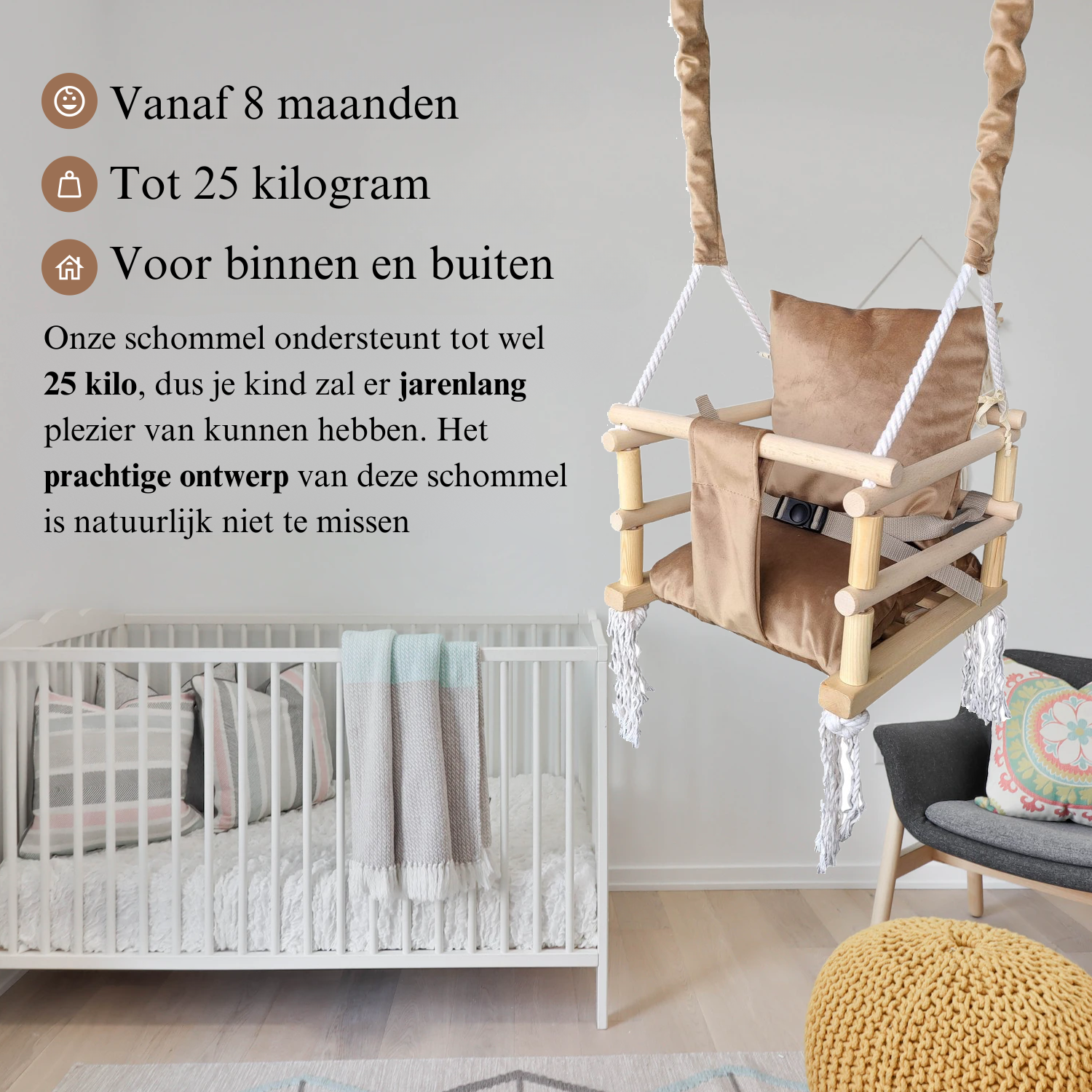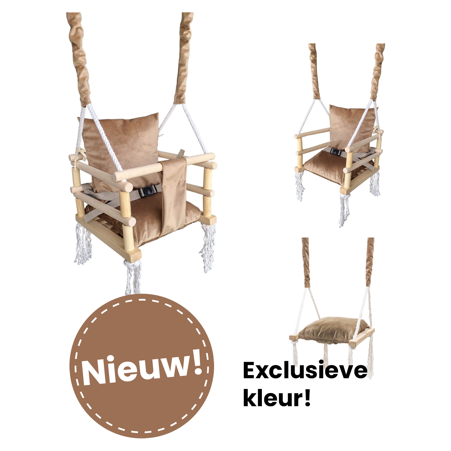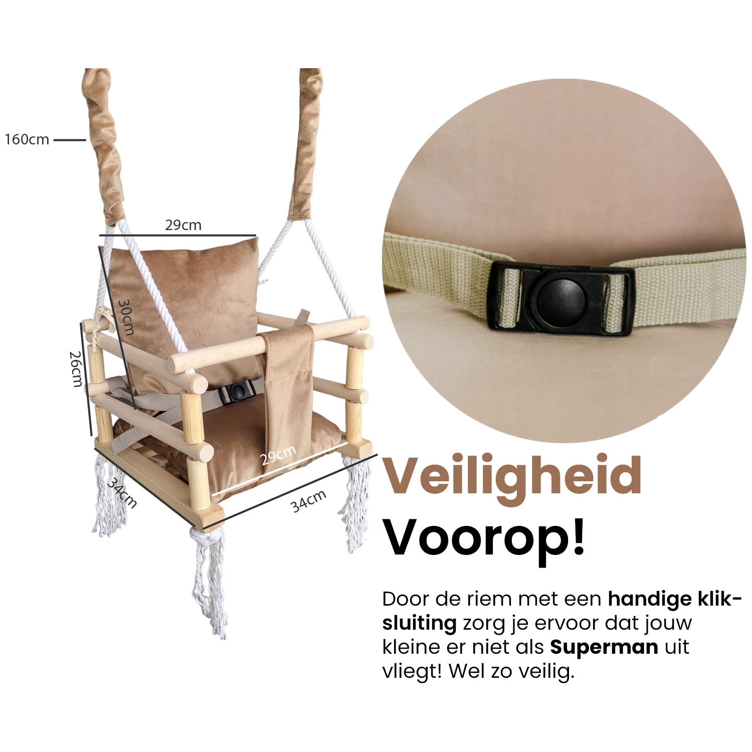 - Deze beige/ bruine schommel draagt tot wel 25 kg