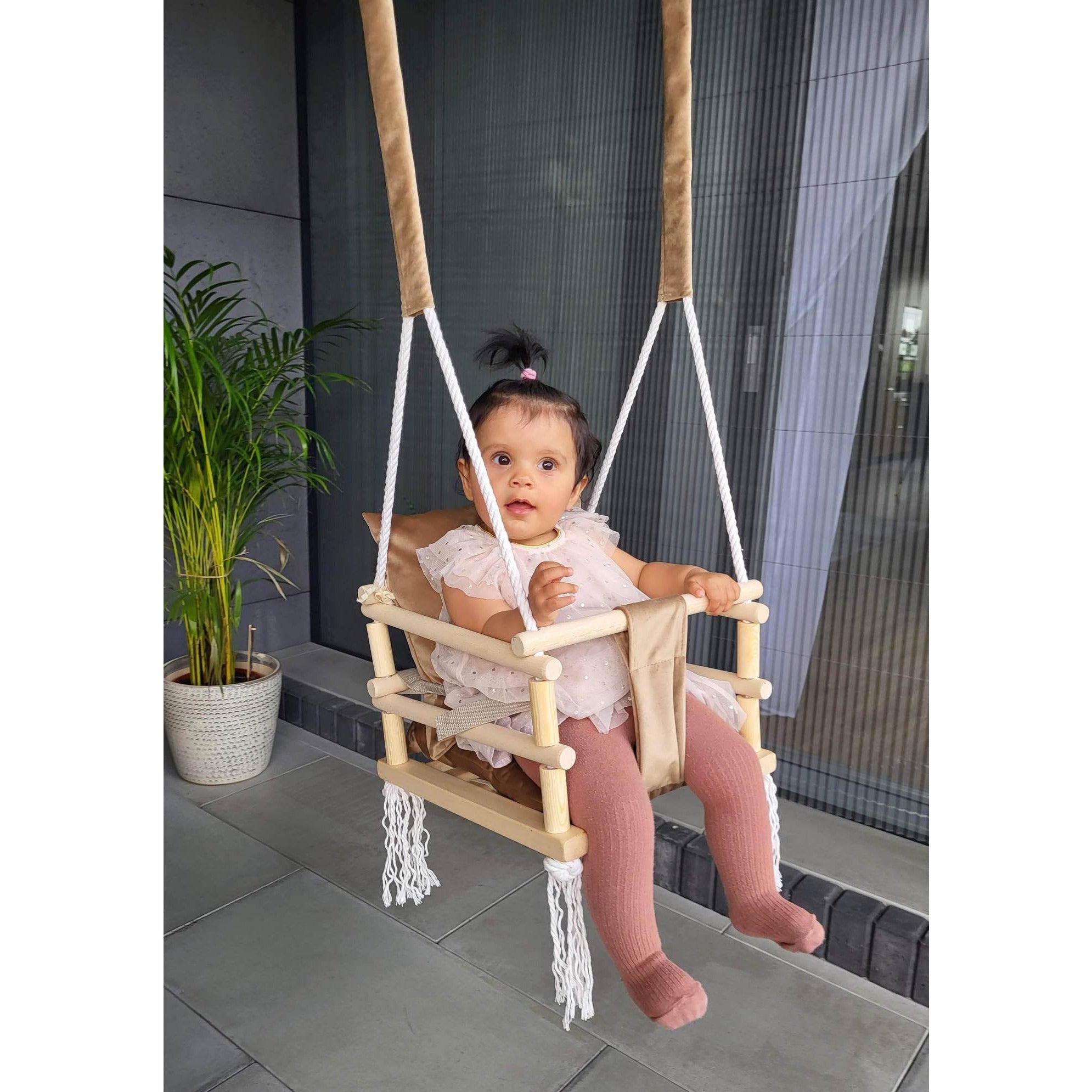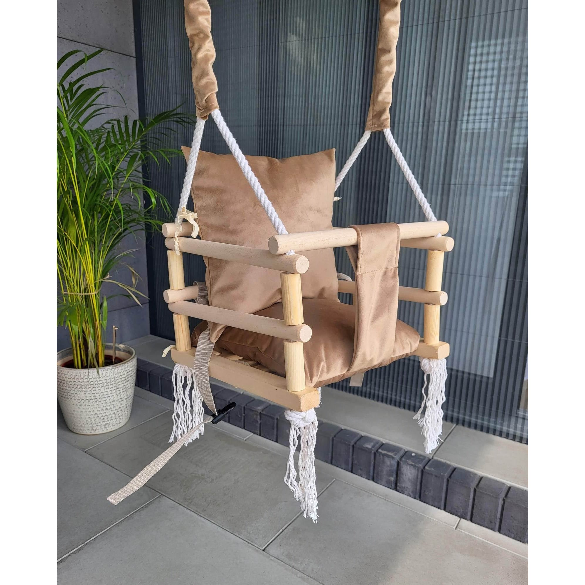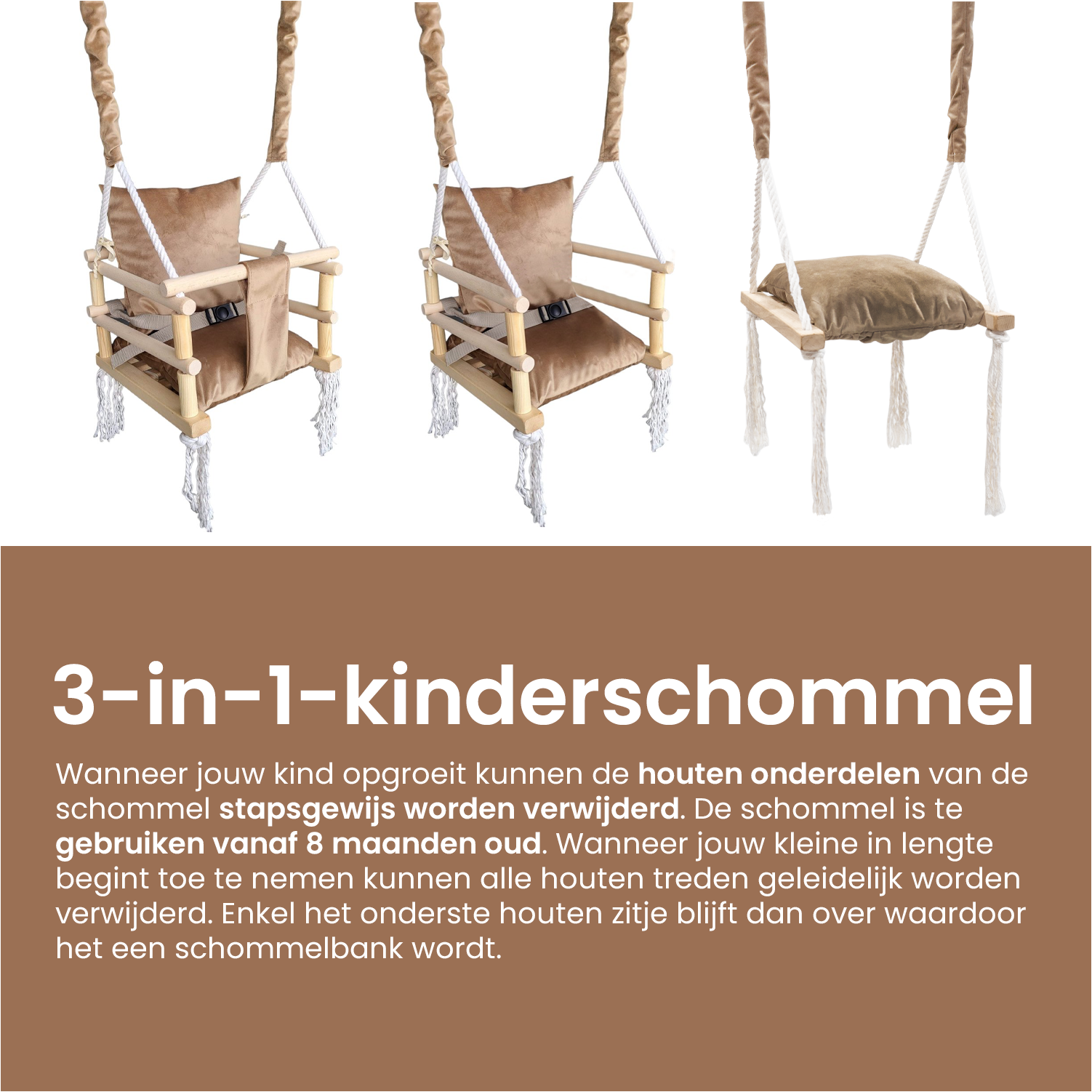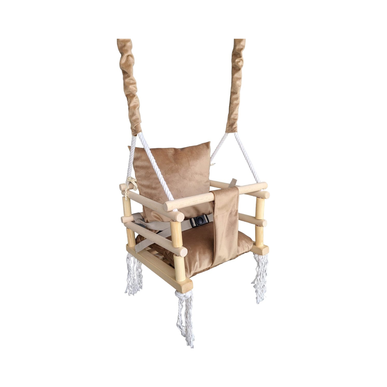 - Deze beige/ bruine schommel draagt tot wel 25 kg