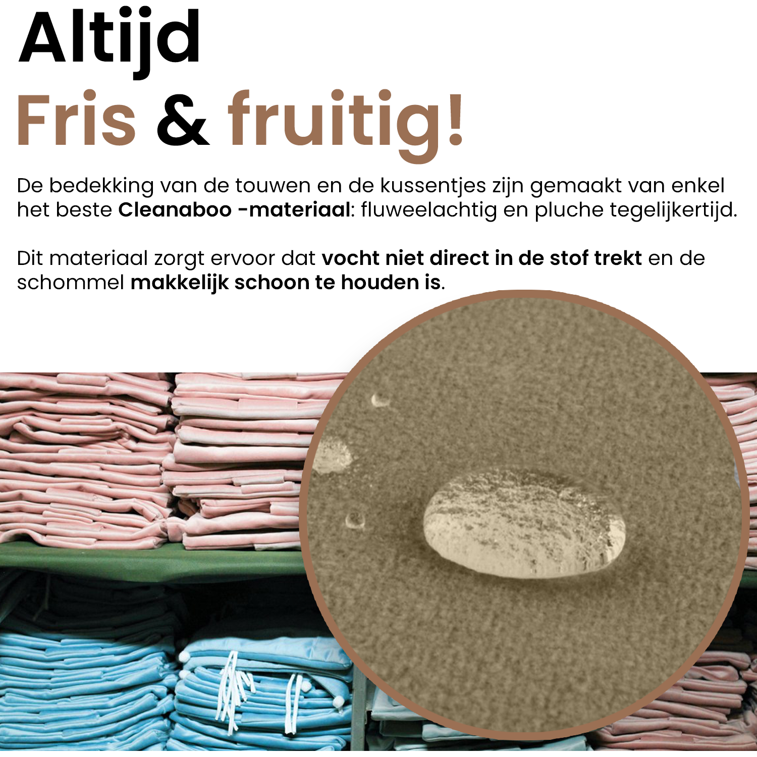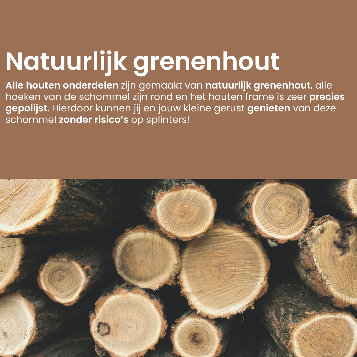 Maar uiterlijk is dit niet alles: de schommel heeft ook een heel veilig ontwerp. Wat heb je aan een mooie schommel als je kind er als een Superman uitvliegt? Alle hoeken van de schommel zijn rond en het houten frame is zeer precies gepolijst. De bedekking van de touwen en de kussentjes zijn gemaakt van enkel het beste Cleanaboo-materiaal: fluweelachtig en pluche tegelijkertijd. Dit materiaal zorgt ervoor dat vocht niet direct in de stof trekt en de schommel makkelijk schoon te houden is. Niet alleen een veilige schommel, maar ook nog eens een schone schommel. Jij blij, je kind blij, iedereen blij.